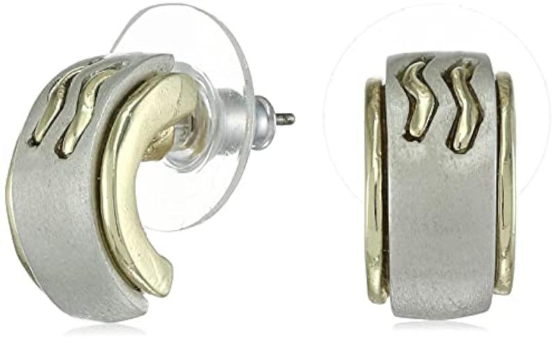 Add a touch of edgy style to your look with these rhodium plated hoop earrings featuring a dual-tone rock striken design.