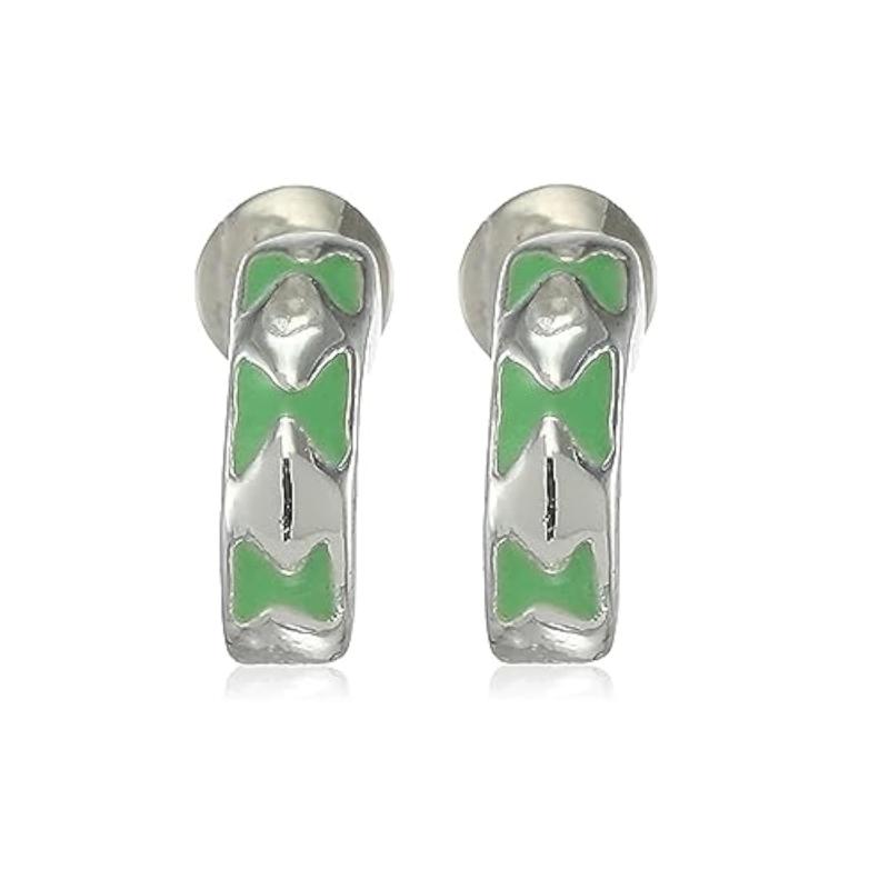 These hoop style earrings feature green hues with enamel detailing. Rhodium plated for durability and shine.