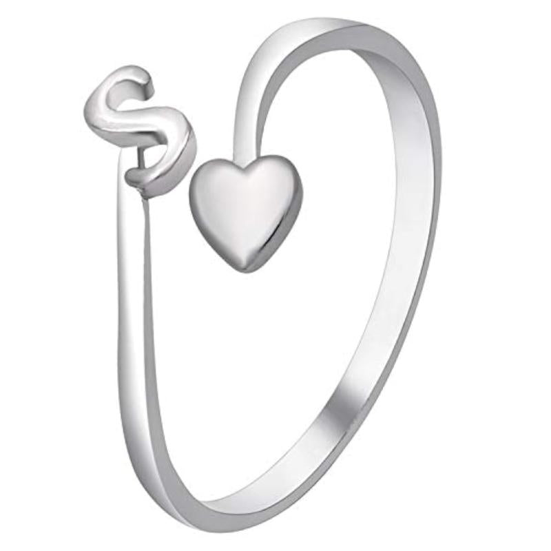 Add a touch of personalized style with this stunning finger ring featuring the letter 'S' initial and heart design. Made with rhodium plating for a shiny finish.