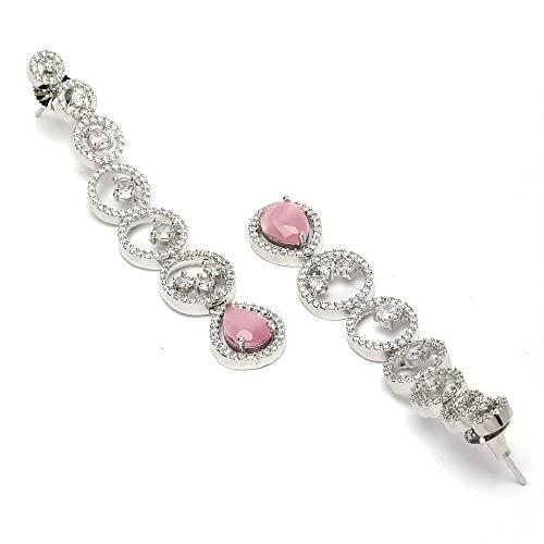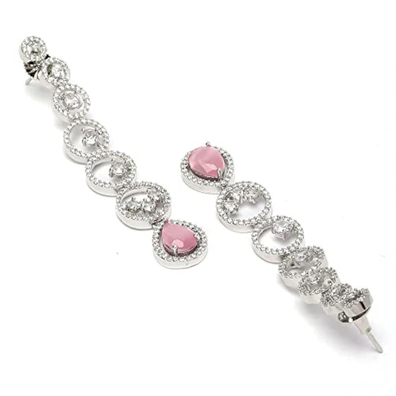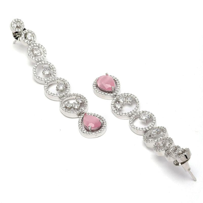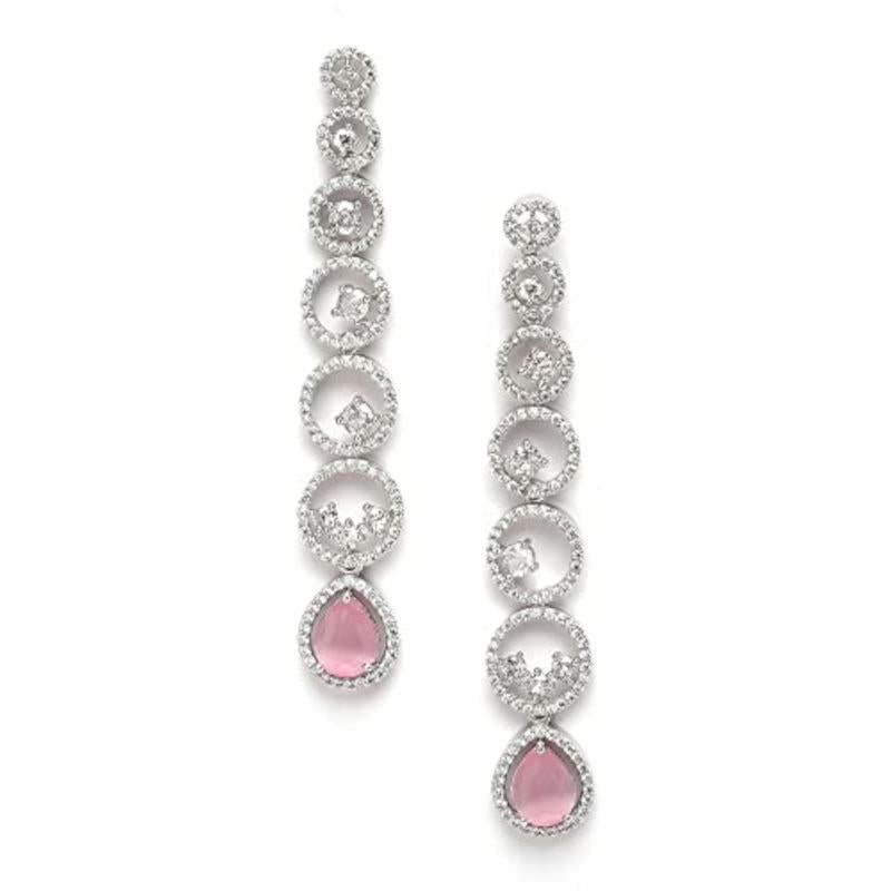 Elegant circular shaped drop earrings with American Diamond studding in silver tone.