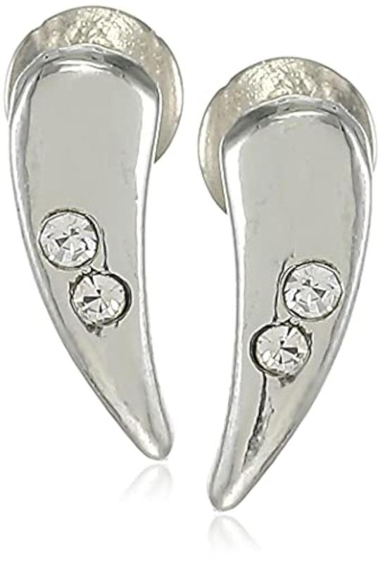 Elegant saber stud earring plated with rhodium and adorned with sparkling Austrian crystals.
