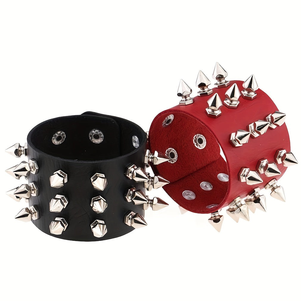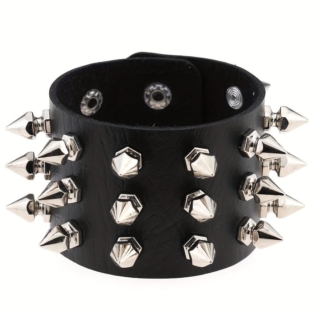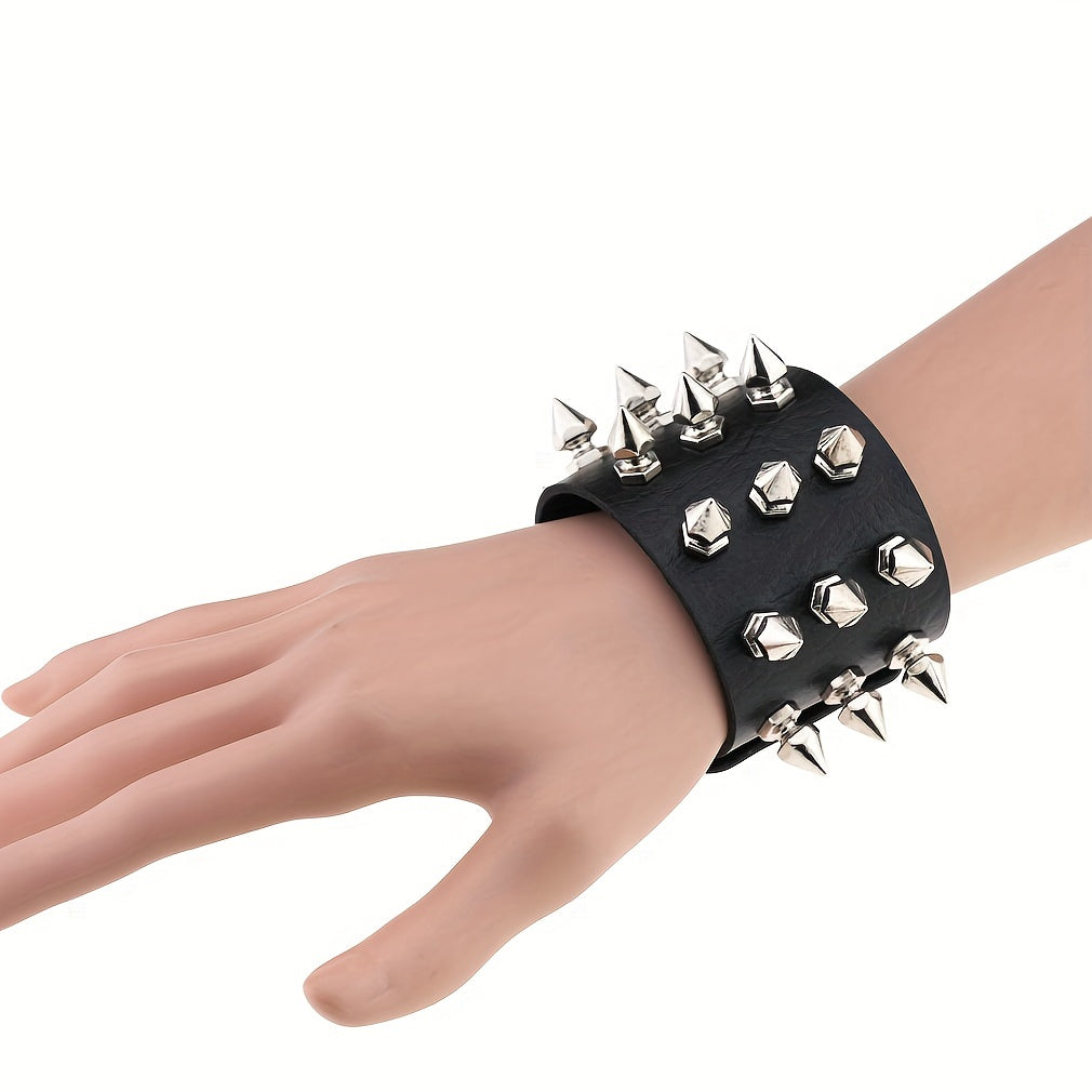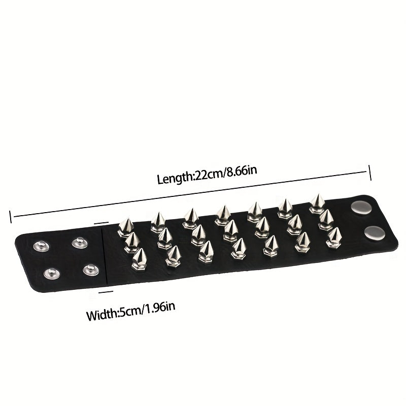 Make a statement with this exaggerated rivet punk style PU leather bangle bracelet, perfect for party favors and adding a bold touch to your outfit.