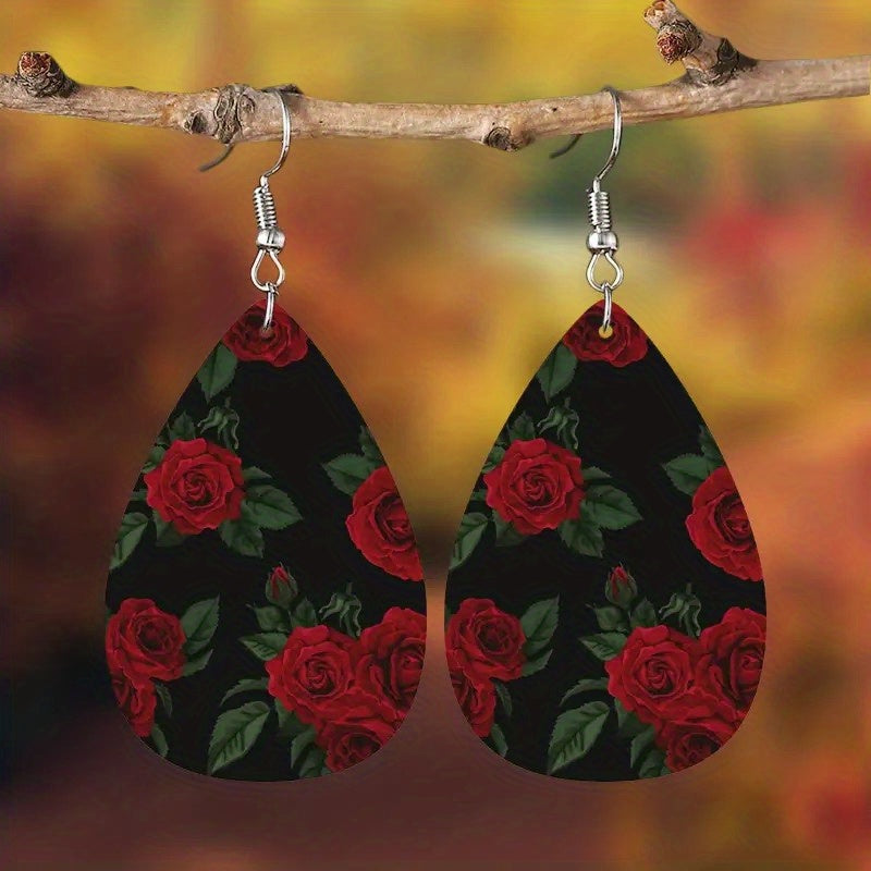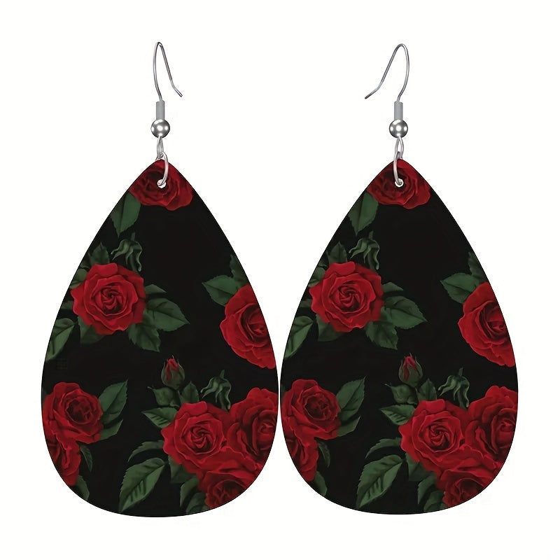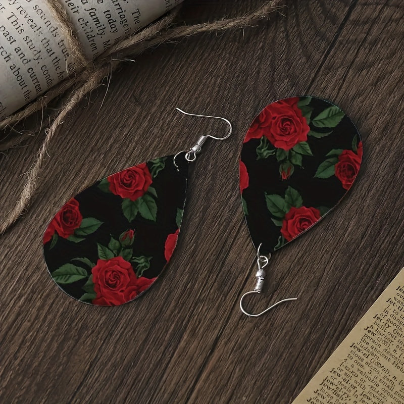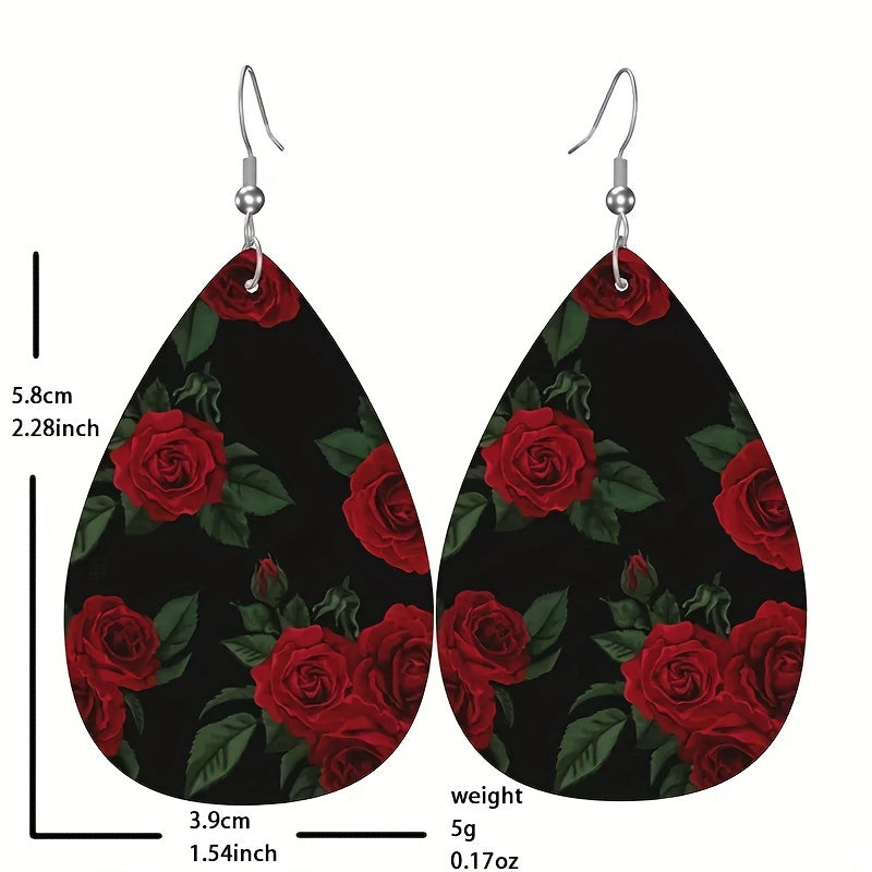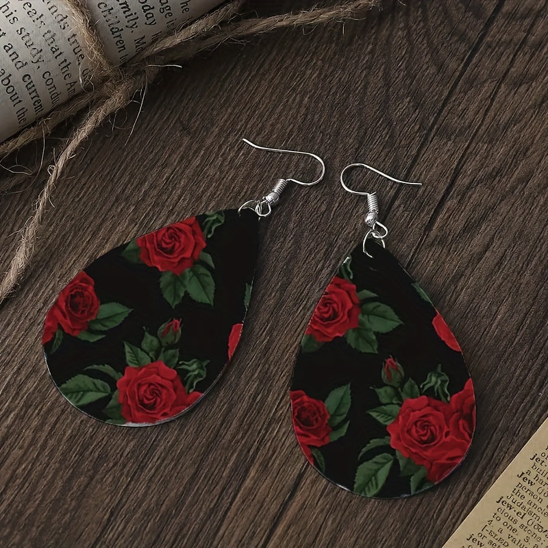 Add a touch of elegance to your party look with these stylish PU leather drop earrings featuring a rose flower design.