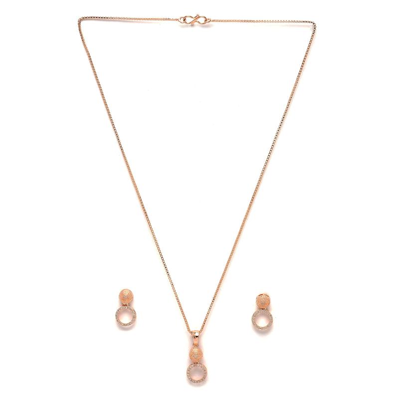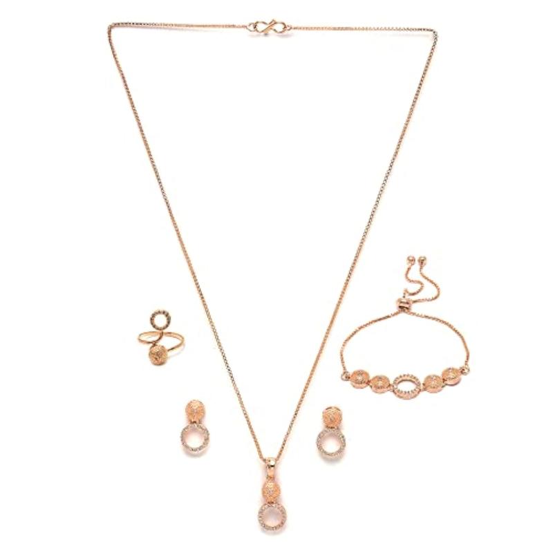 Elegant set including necklace, earrings, bracelet, and ring with American Diamond studded design.