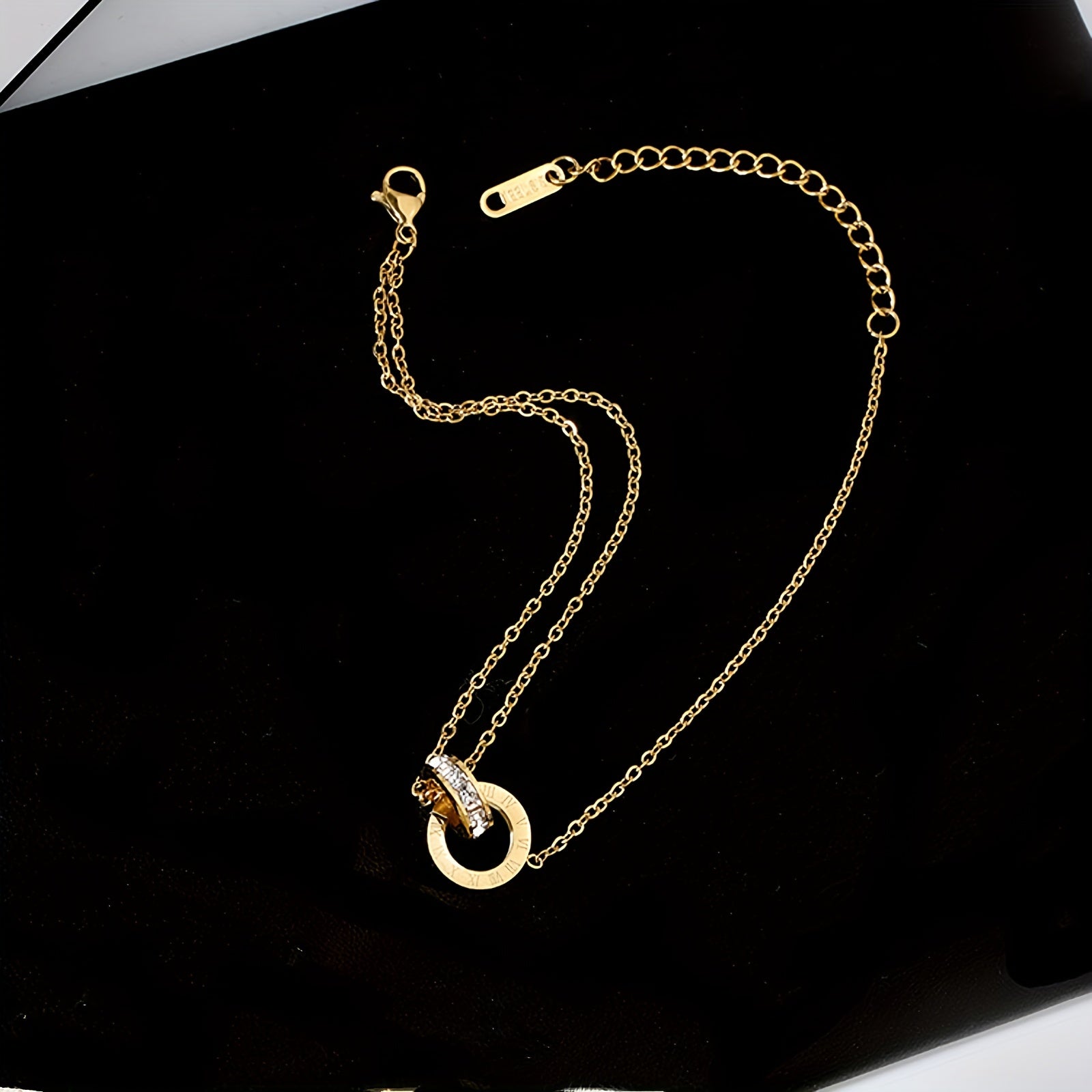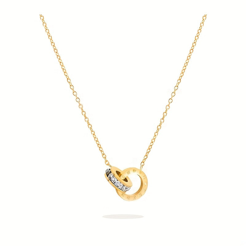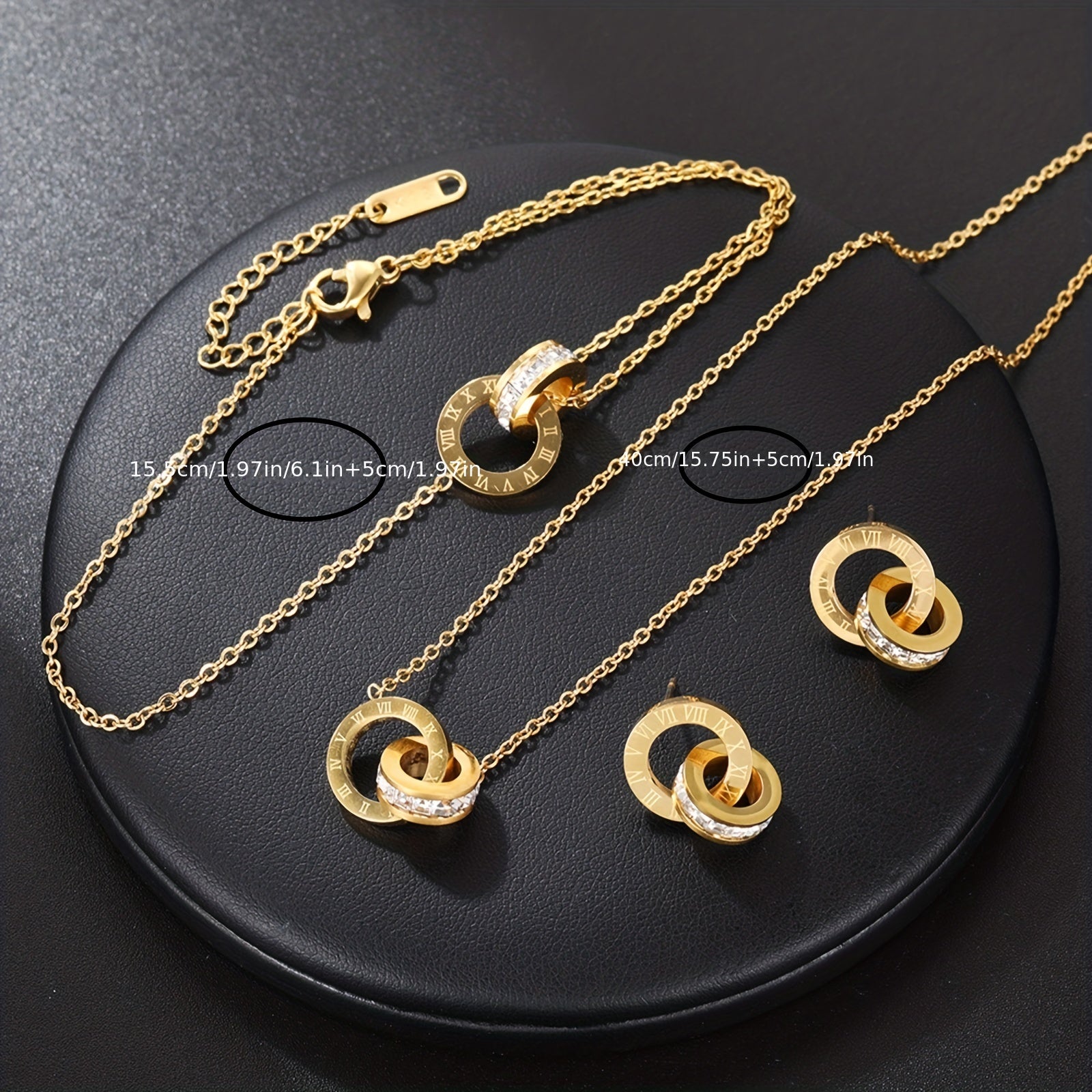 Complete your look with this elegant set of rose gold stainless steel jewelry that includes a necklace, bracelet, and earrings featuring Roman numerals design.