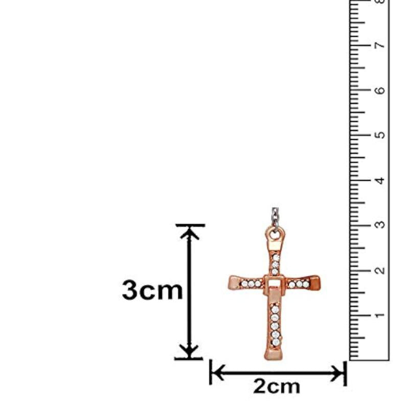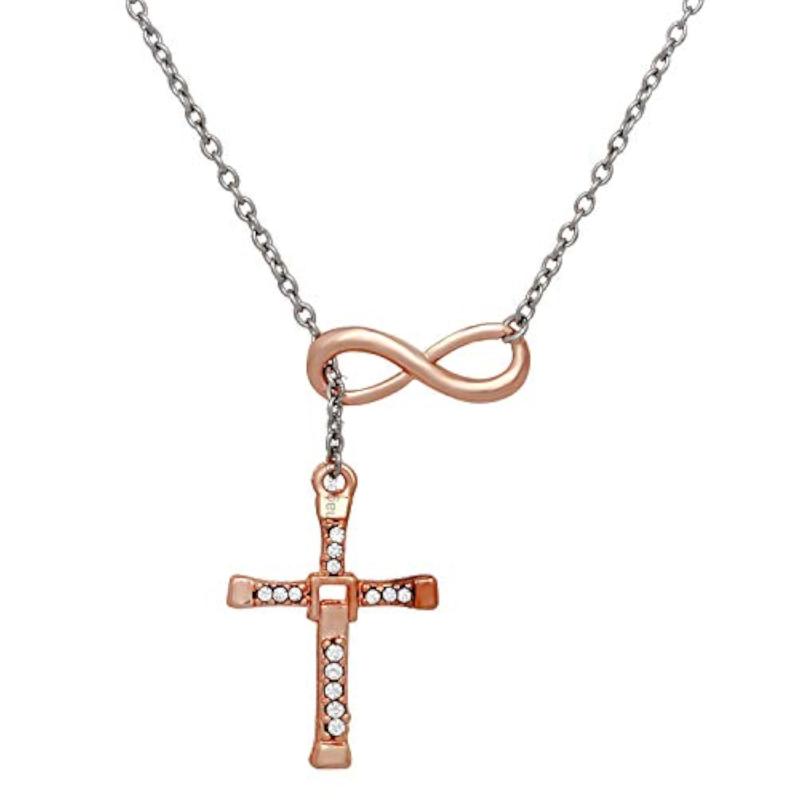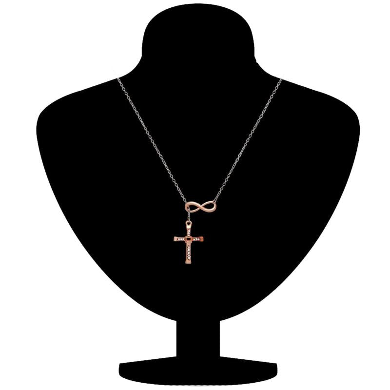 Stunning rose gold plated pendant necklace featuring an infinity cross symbol adorned with sparkling crystals.