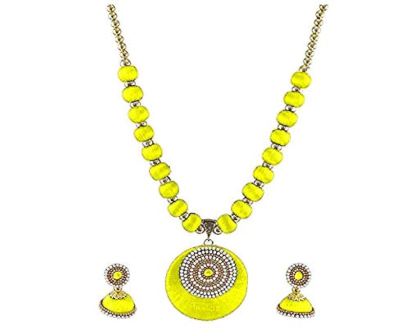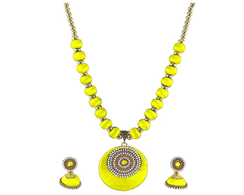Elegant and stylish set with matching pendant necklace and earrings made of silk.
