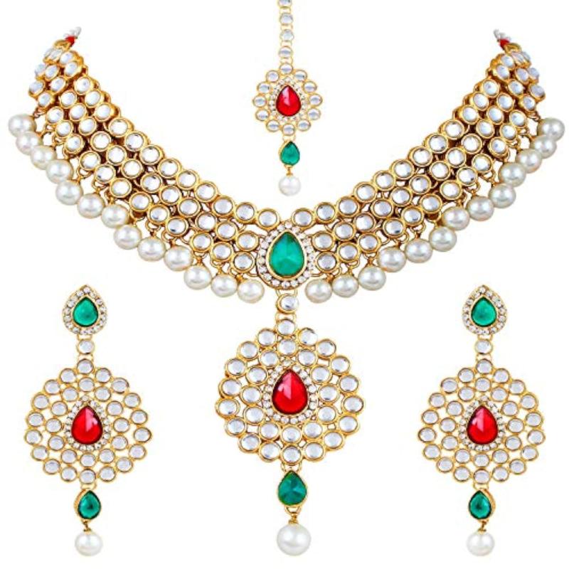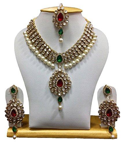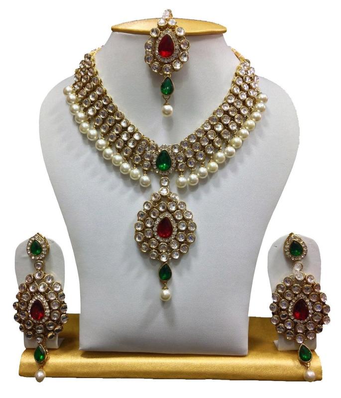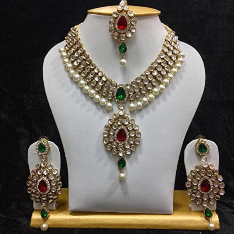 This traditional jewellery set features stunning ruby and pearl embellishments in a Kundan design.