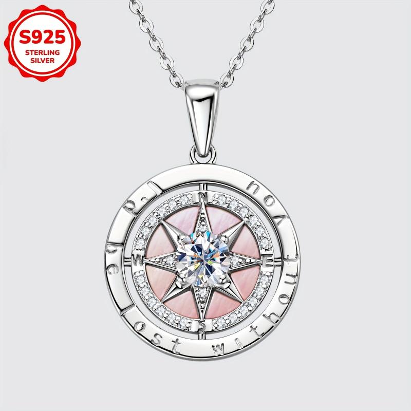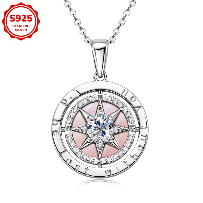 S925 Compass Pendant Necklace Pink Mother of Pearl CZ