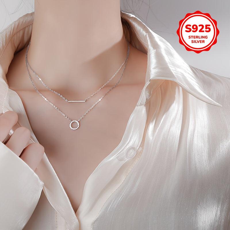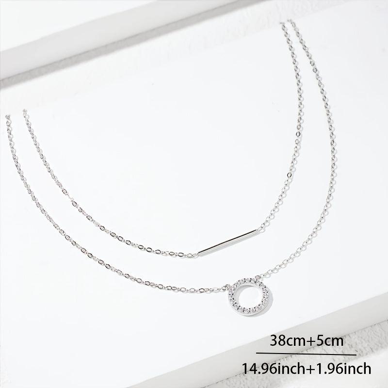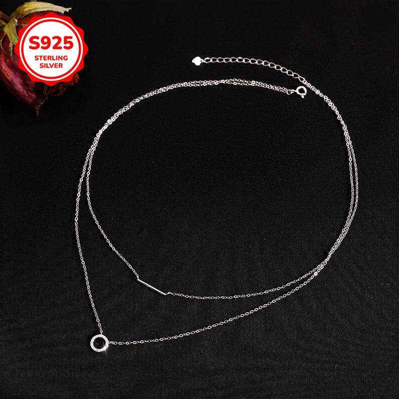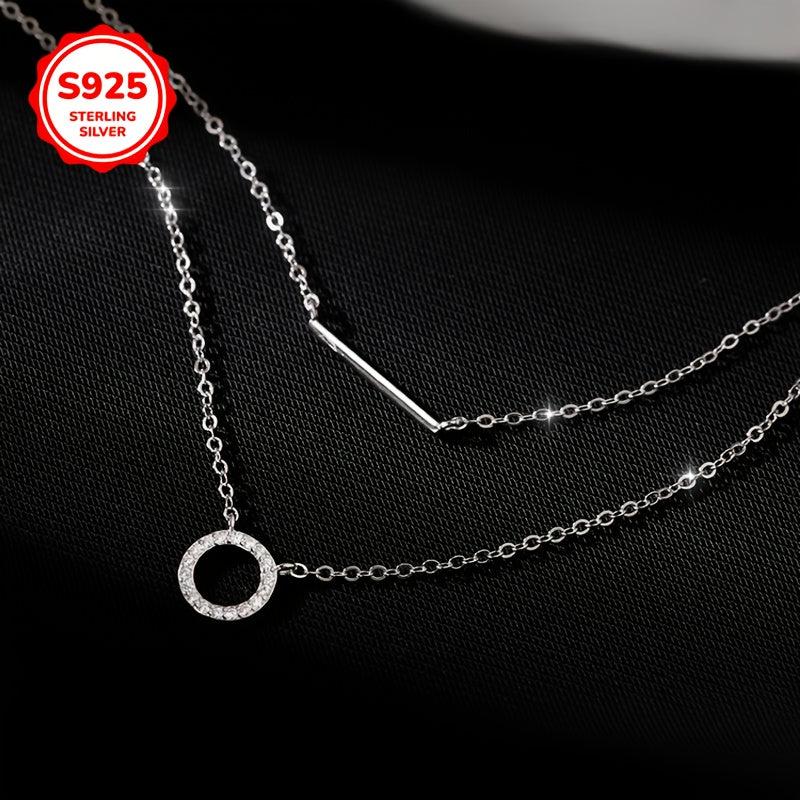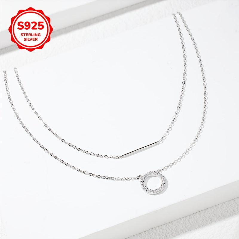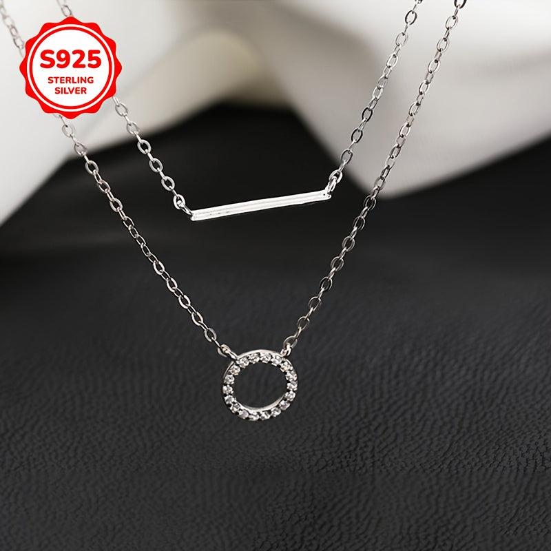 Elegantly designed S925 pure silvery necklace featuring a double-layered bar and circle pendant. Decorated with synthetic zirconia for added sparkle. Versatile and perfect for daily wear.