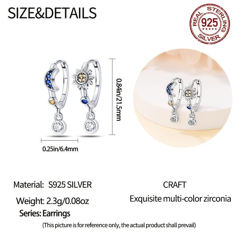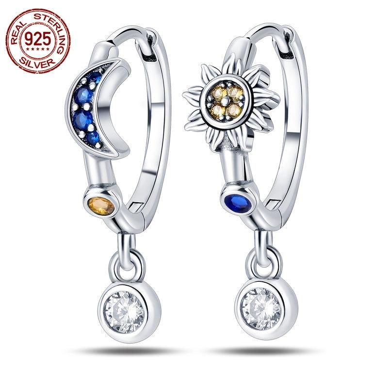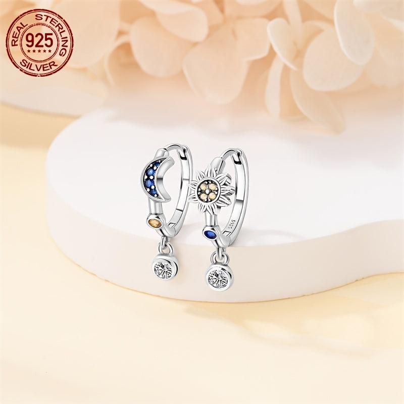 Elegant pair of S925 pure silvery earrings featuring a sun and moon design. Perfect as a gift for women with sensitive skin.