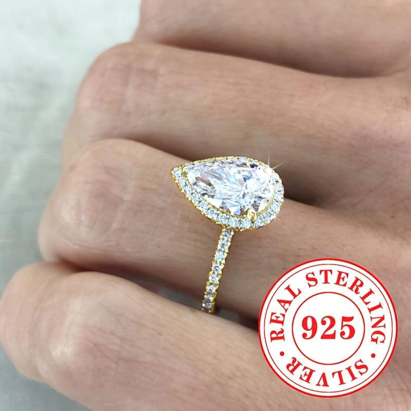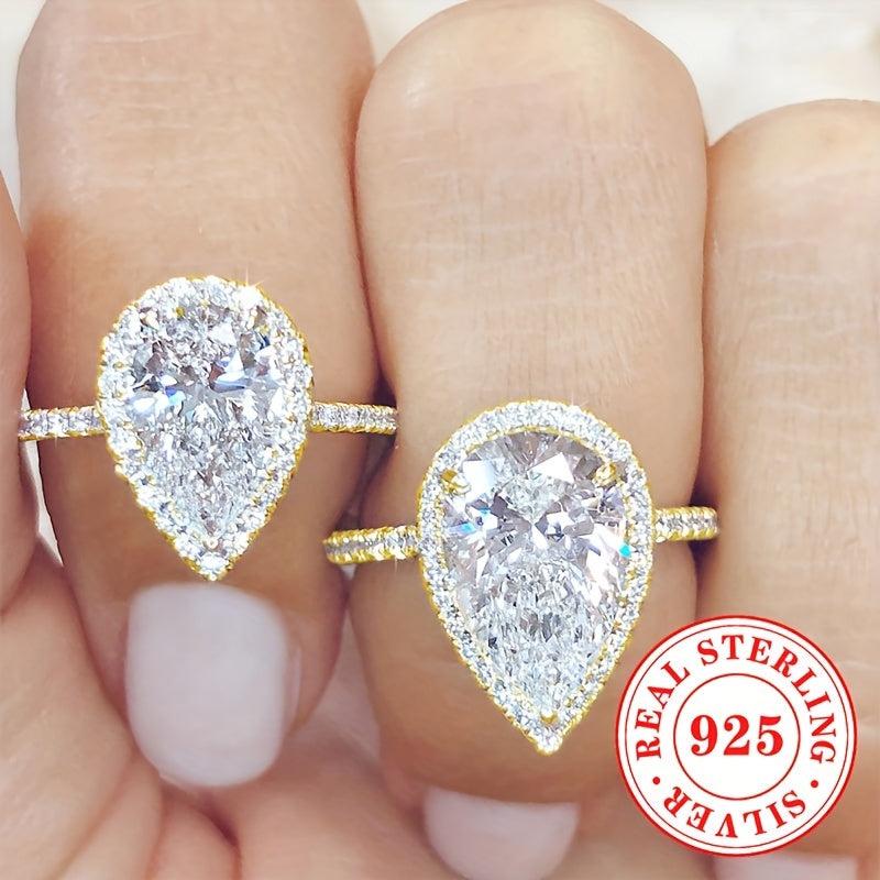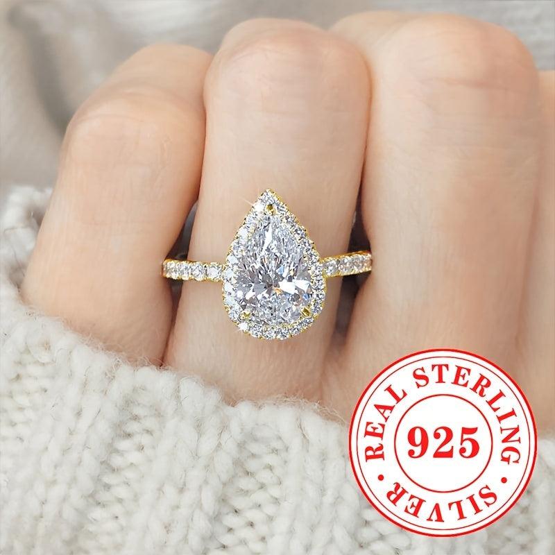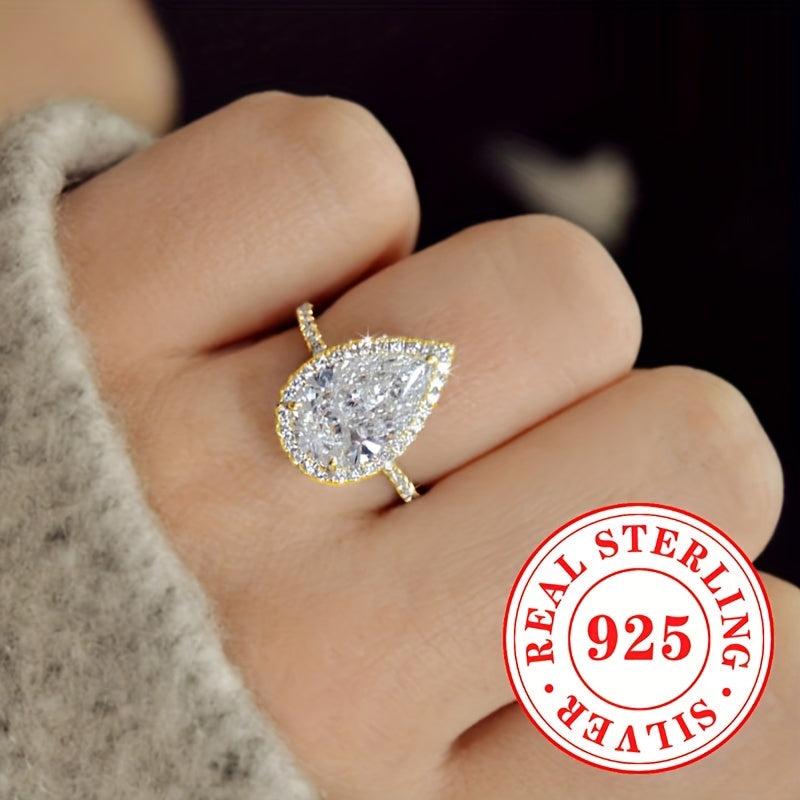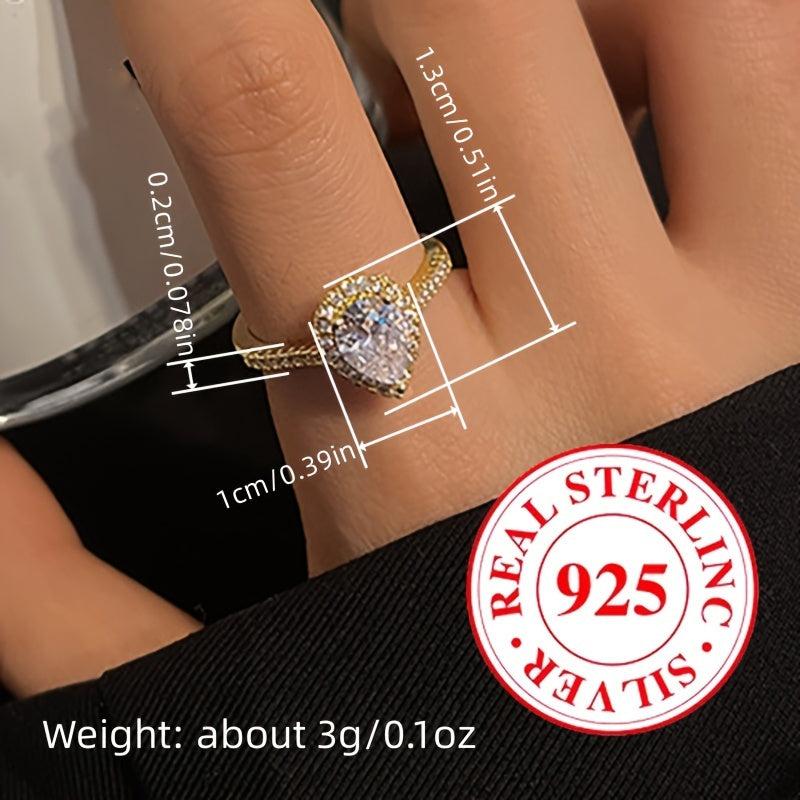 Elegant S925 silver engagement ring set with water drop shaped synthetic zirconia, perfect for wedding and proposal. High-end jewelry suitable for banquet wear.
