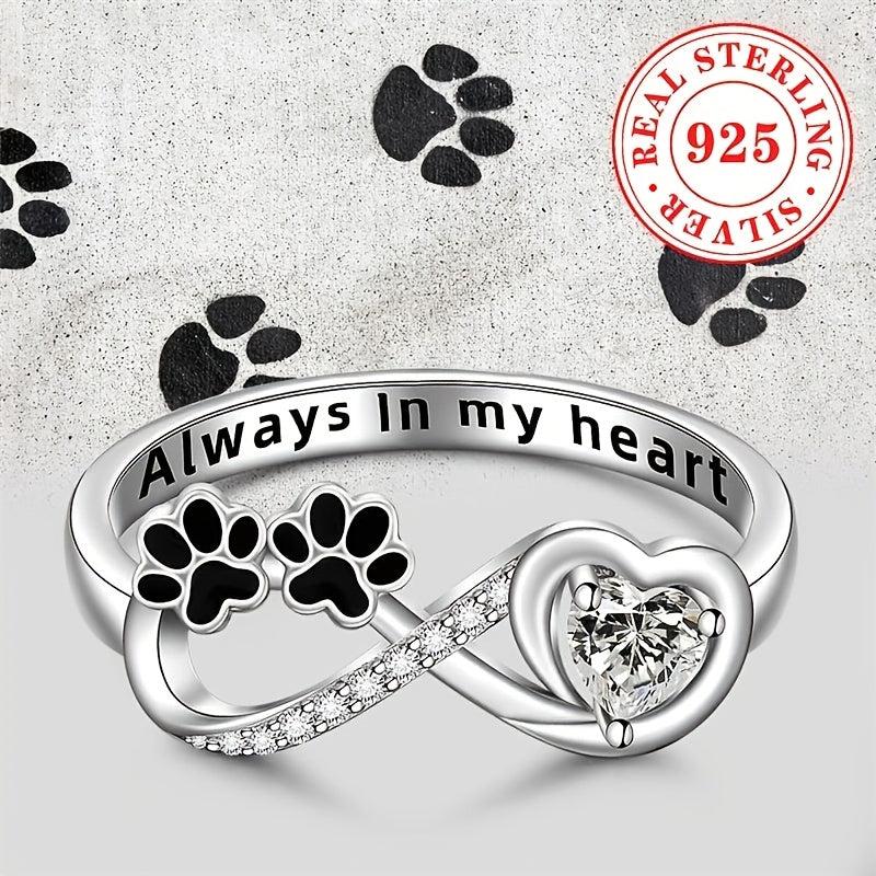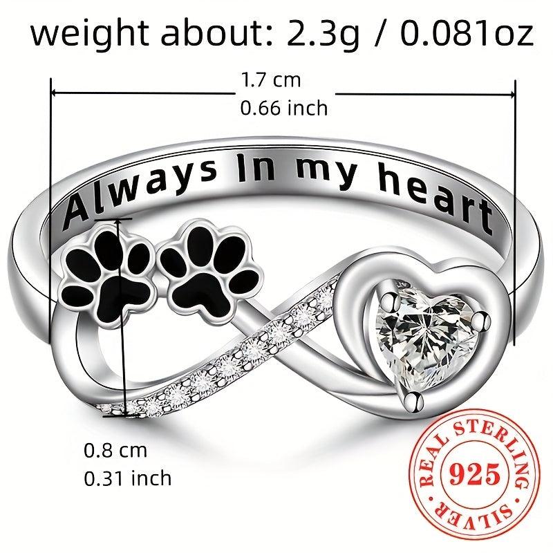 This elegant women's ring is crafted from pure S925 silver, weighing 2.3 grams. It features a unique design with an animal paw print inlaid with synthetic zirconia as a heart infinity symbol.
