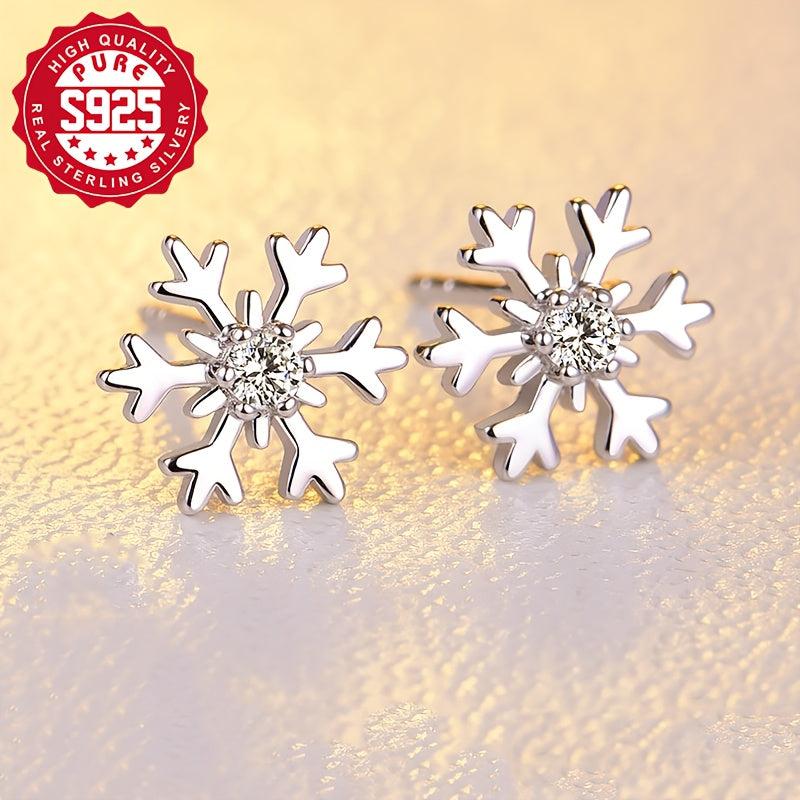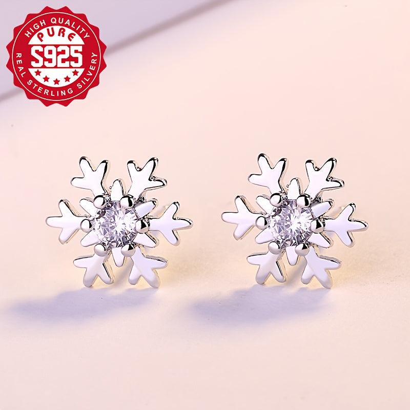 These elegant S925 silver earrings feature snowflake design with synthetic zirconia inlays. Perfect for festive occasions and gifting, safe for low allergy.