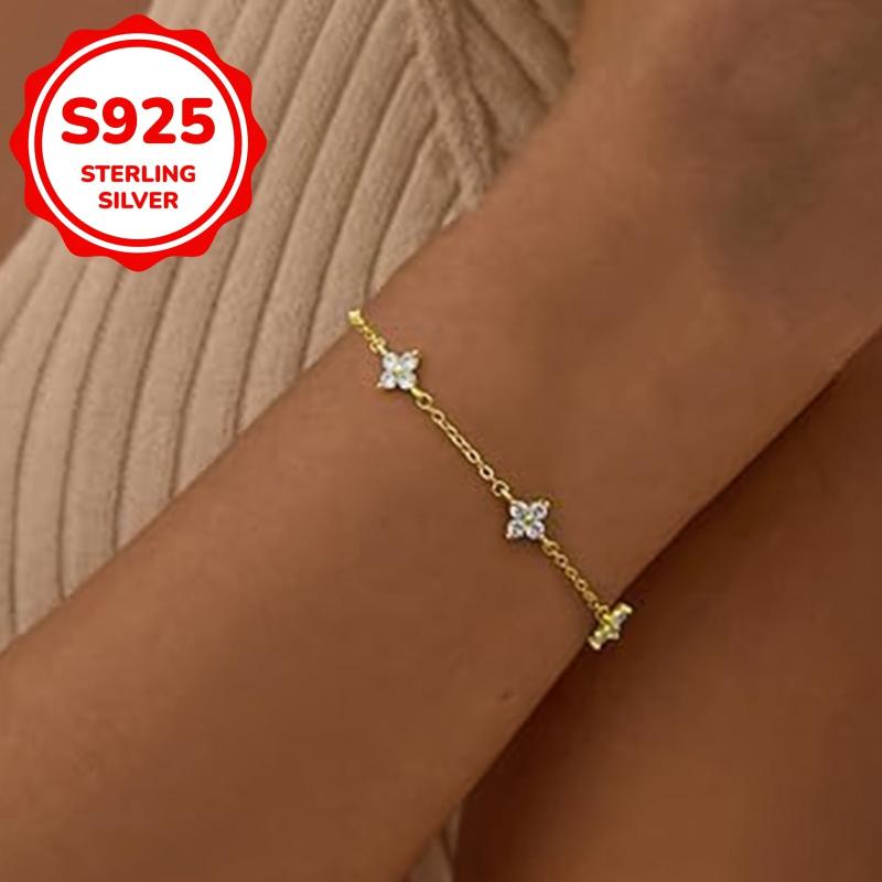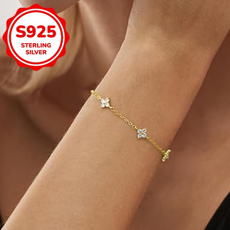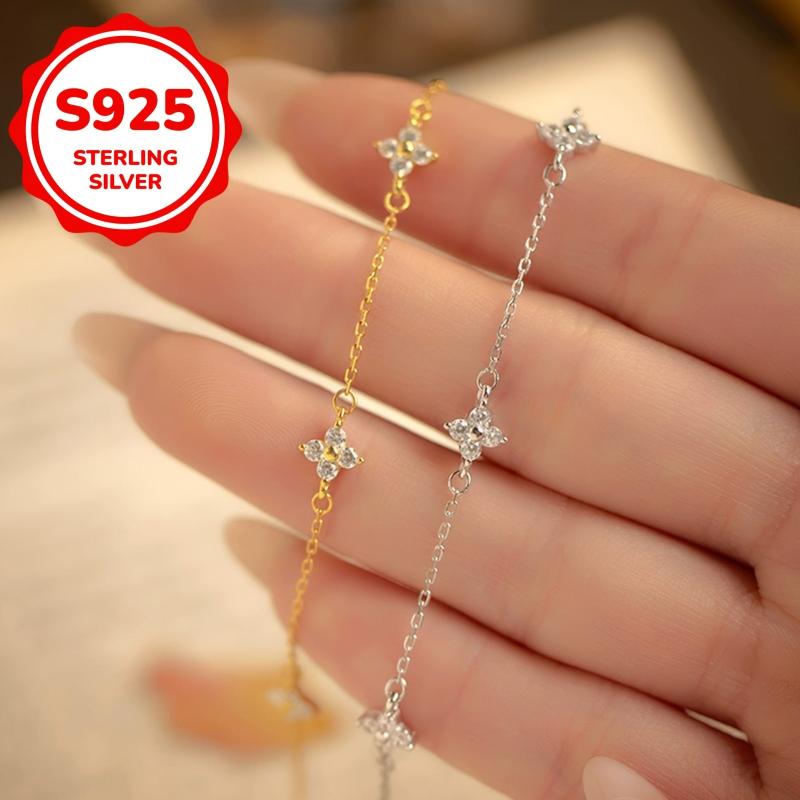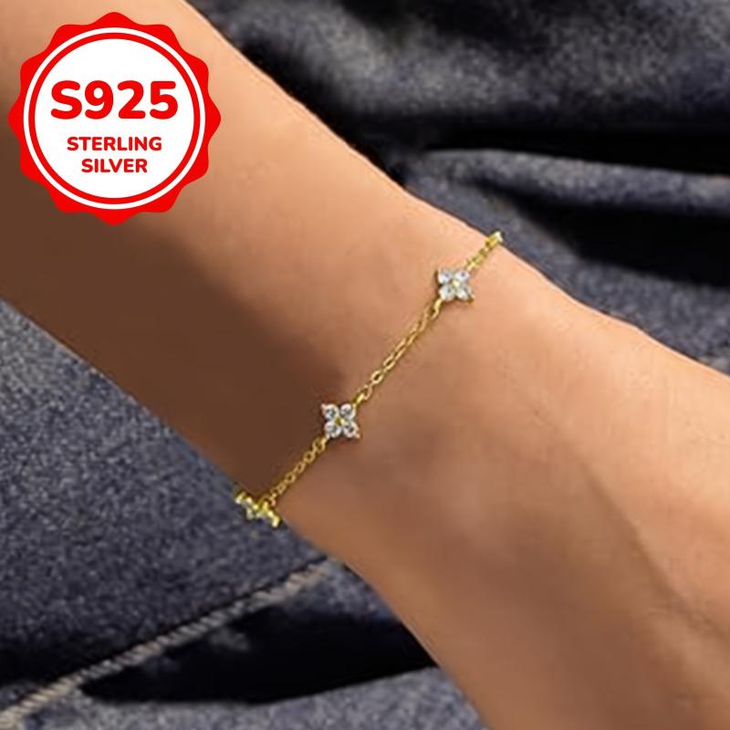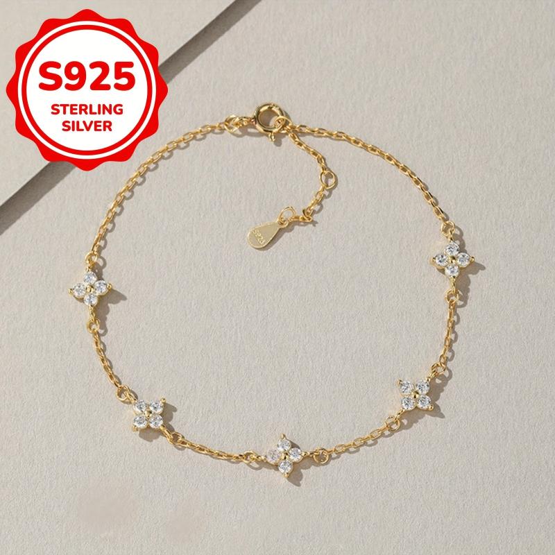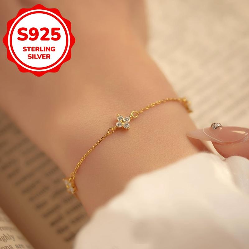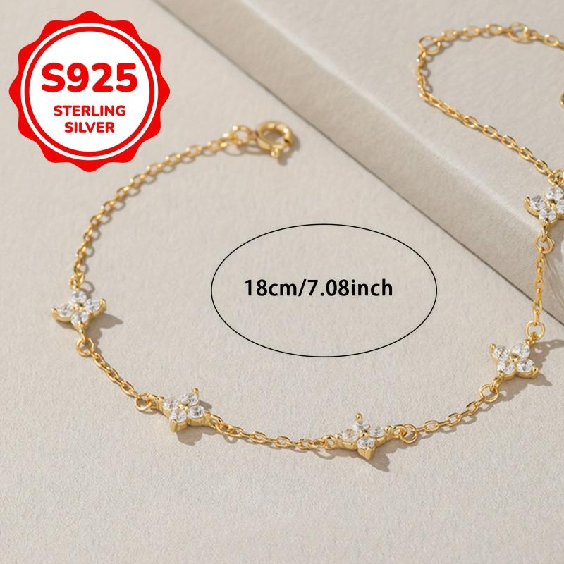 This S925 silver bracelet features a sparkling four-leaf clover design with cubic zirconia stones. It is lightweight at 1.6g, making it perfect for daily wear, weddings, and as an ideal gift for mothers.