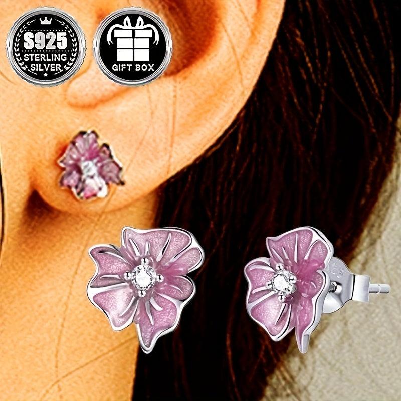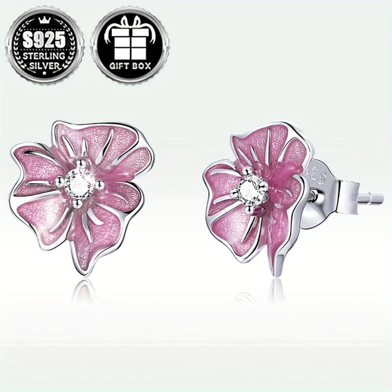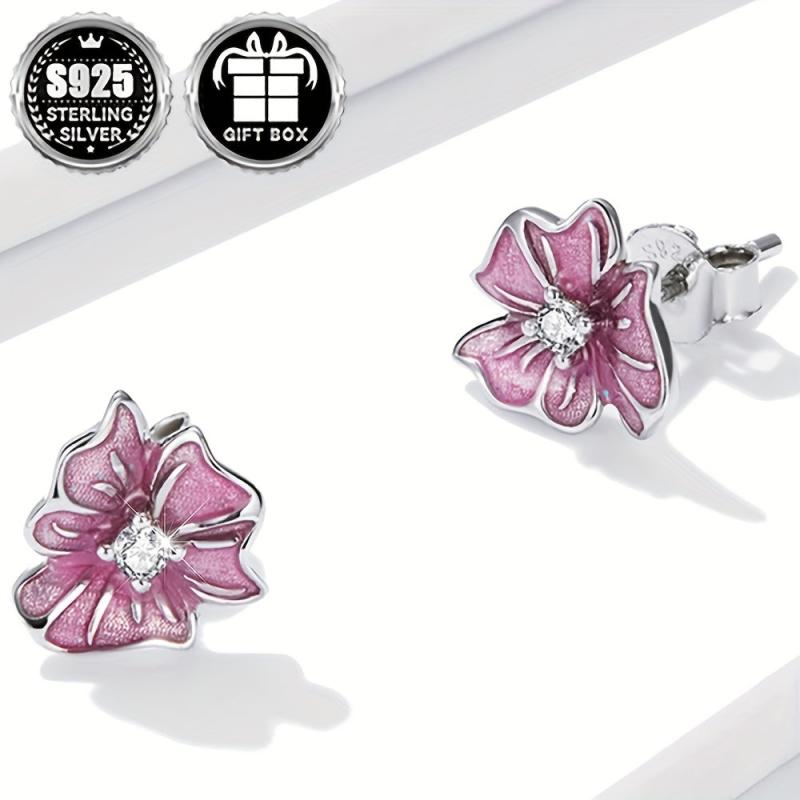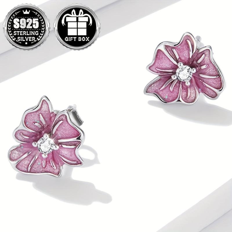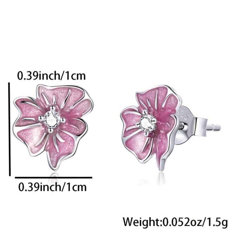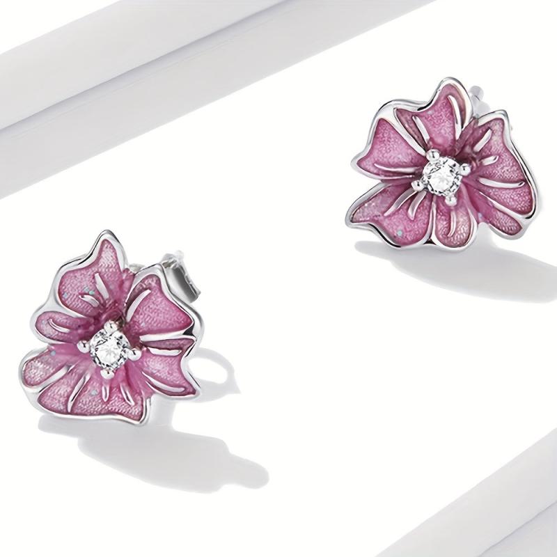 Elegant stud earrings made of pure silver with blooming flower center and pink flower inlay. Perfect for a fashionable look.