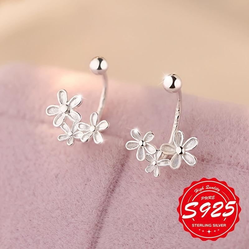 These elegant S925 silver earrings feature a design of three flowers on a curved hook with a screw closure. They are perfect for adding a touch of sweetness and style to your daily outfits, parties, and various occasions.