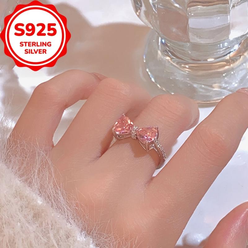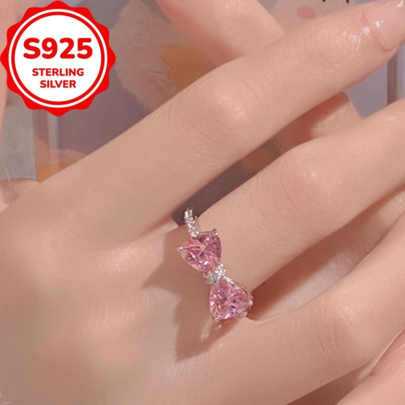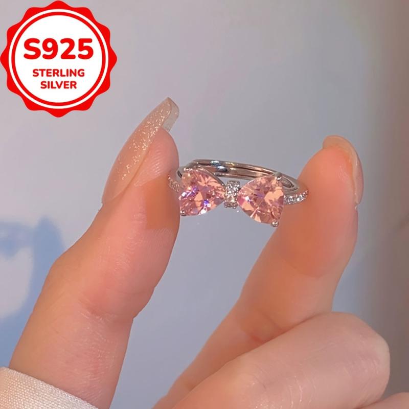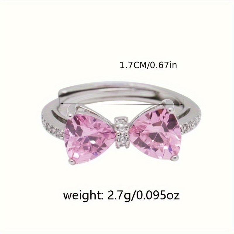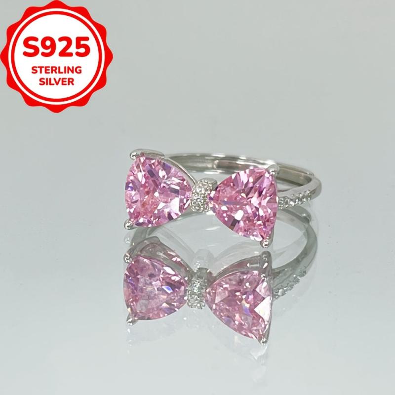 This stunning ring features a bow design with a pink and cubic zirconia stone, crafted from S925 sterling silver and finished with platinum plating. Perfect for engagement parties and Valentine's Day!
