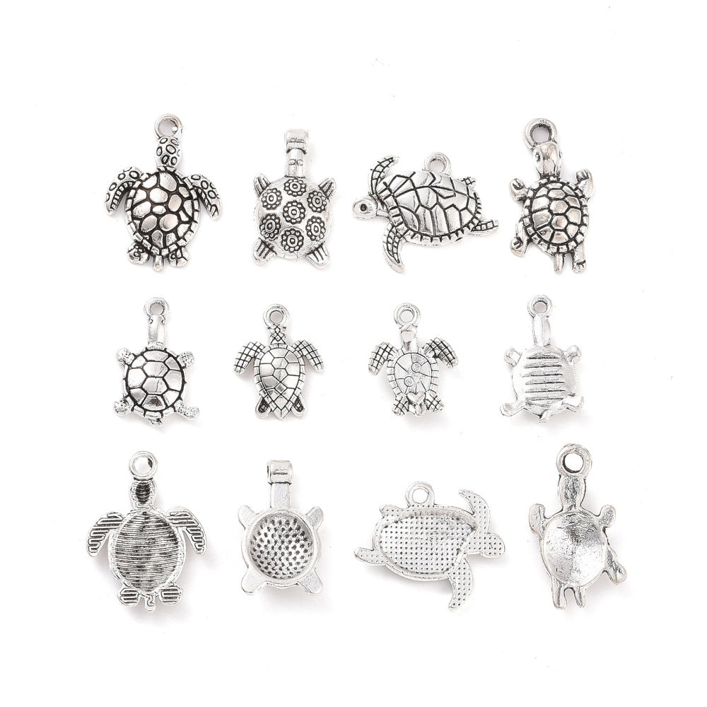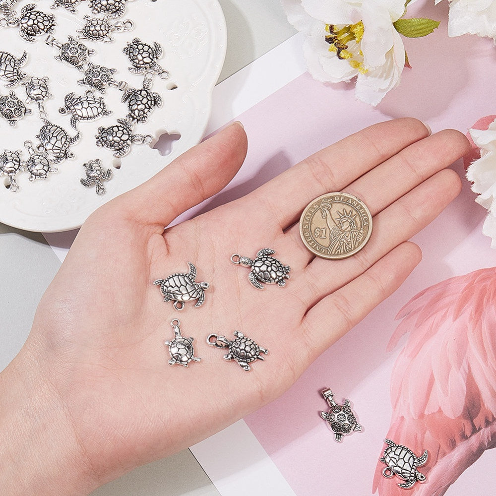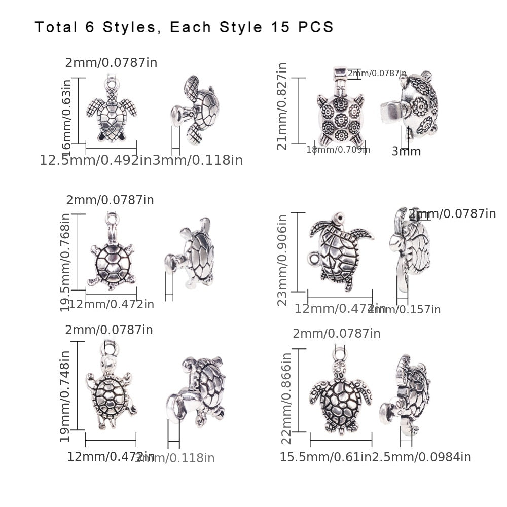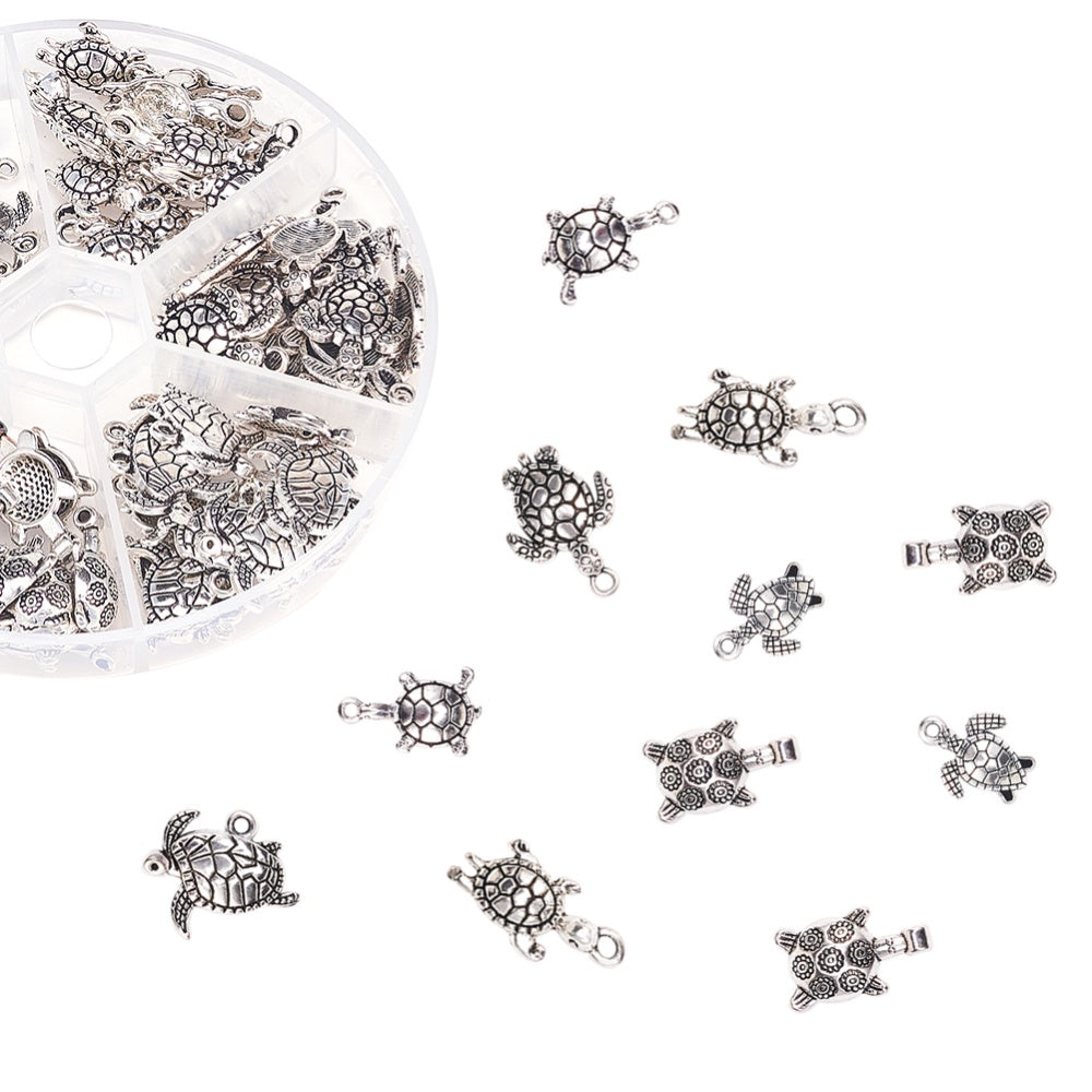 Get this box of 90pcs of 6 styles sea turtle shape alloy pendants, perfect for DIY bracelet and necklace making. These antique silver beads are ideal for crafting unique jewelry pieces.