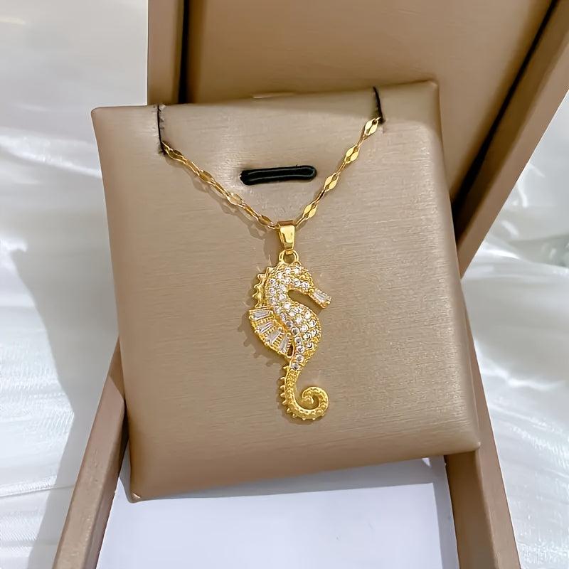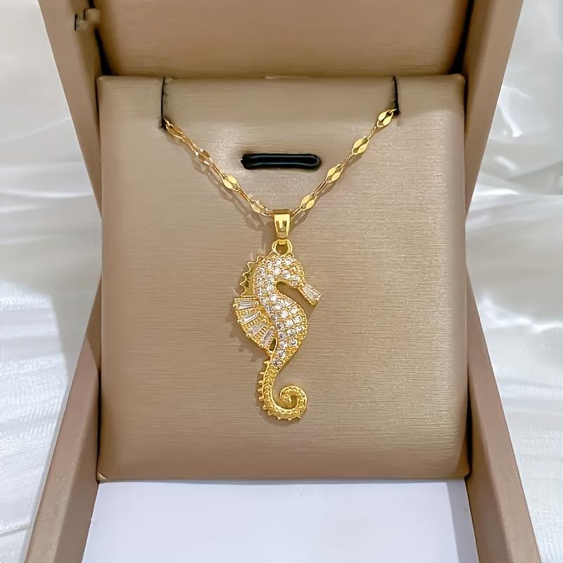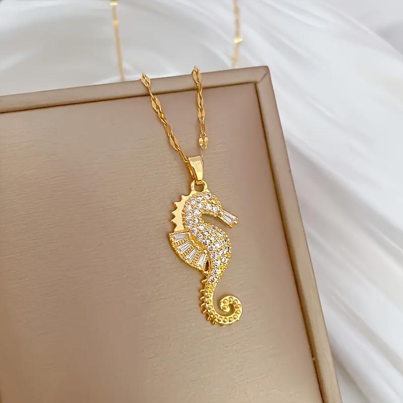 Elegant seahorse pendant necklace featuring sparkling cubic zirconia. Perfect for daily wear or parties, suitable for both women and men.