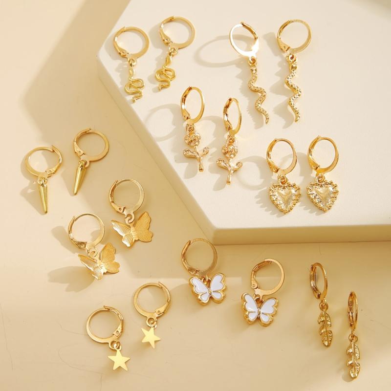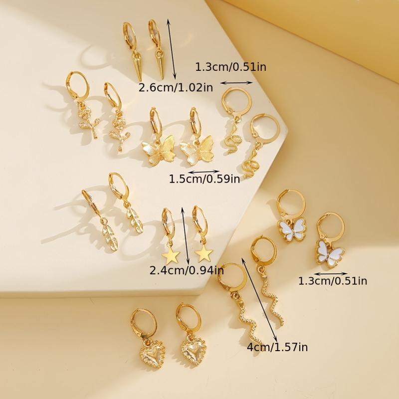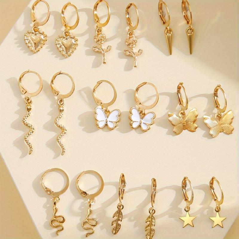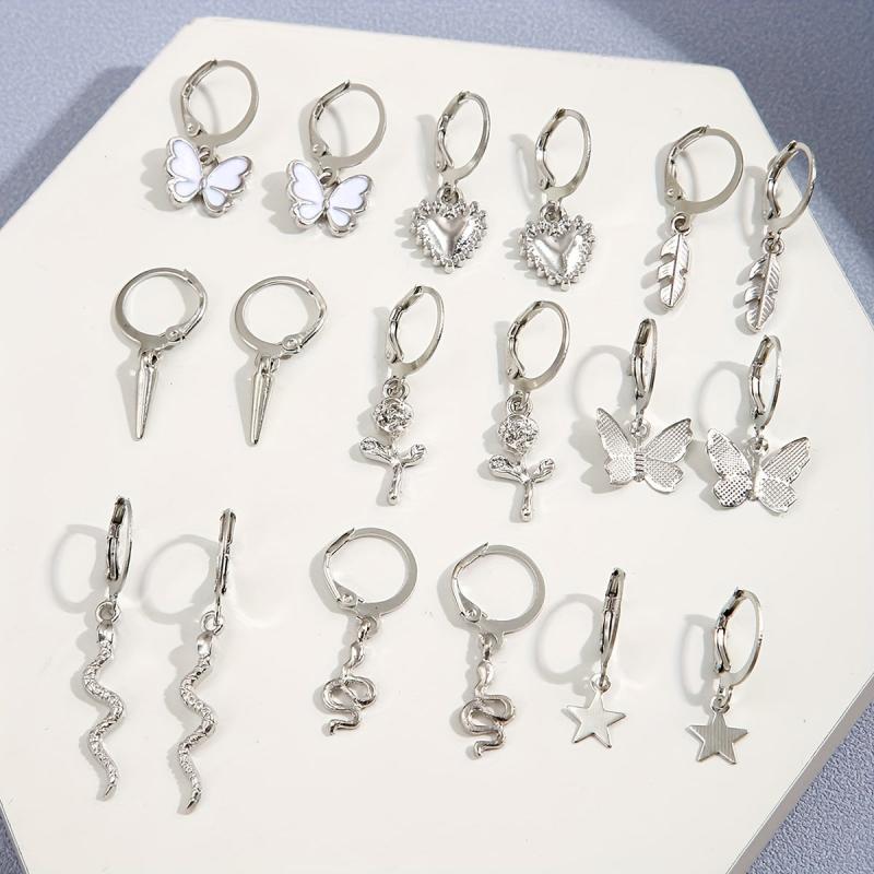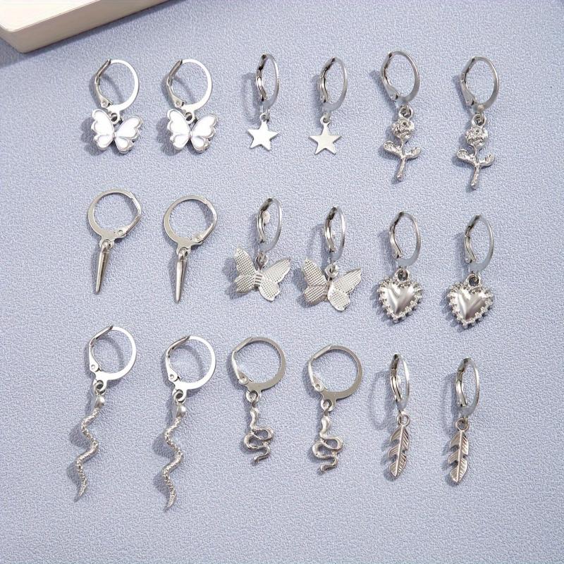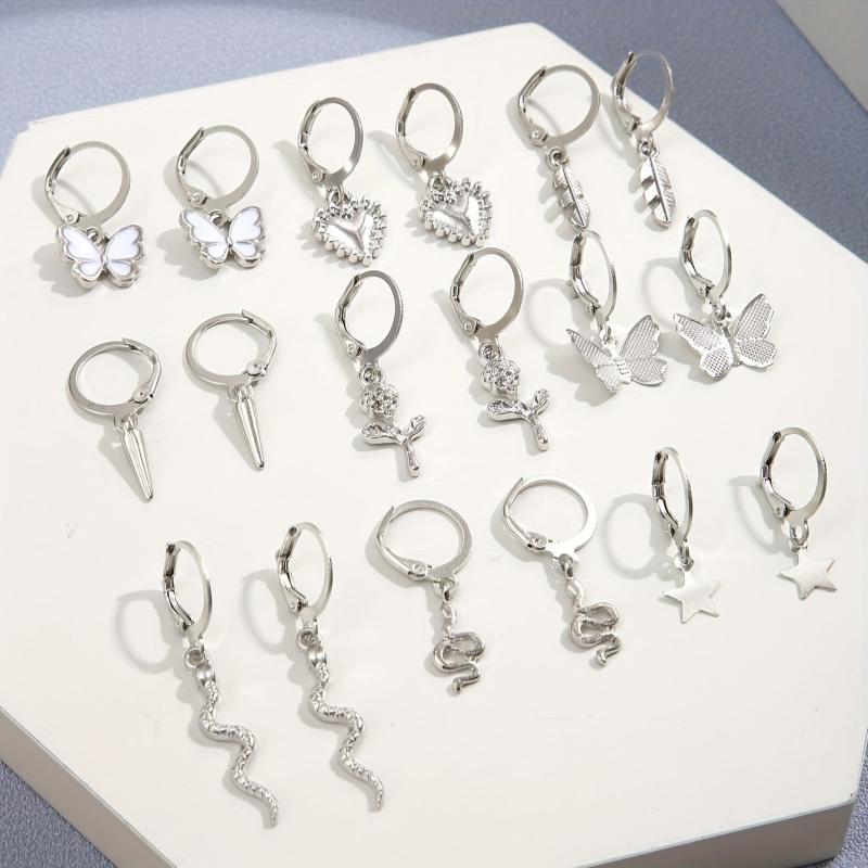 A stylish set of 18 retro-themed earrings featuring heart, butterfly, flower, snake, star, and leaf designs. Perfect for festivals, vacations, or casual wear.