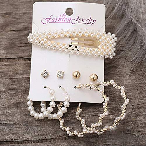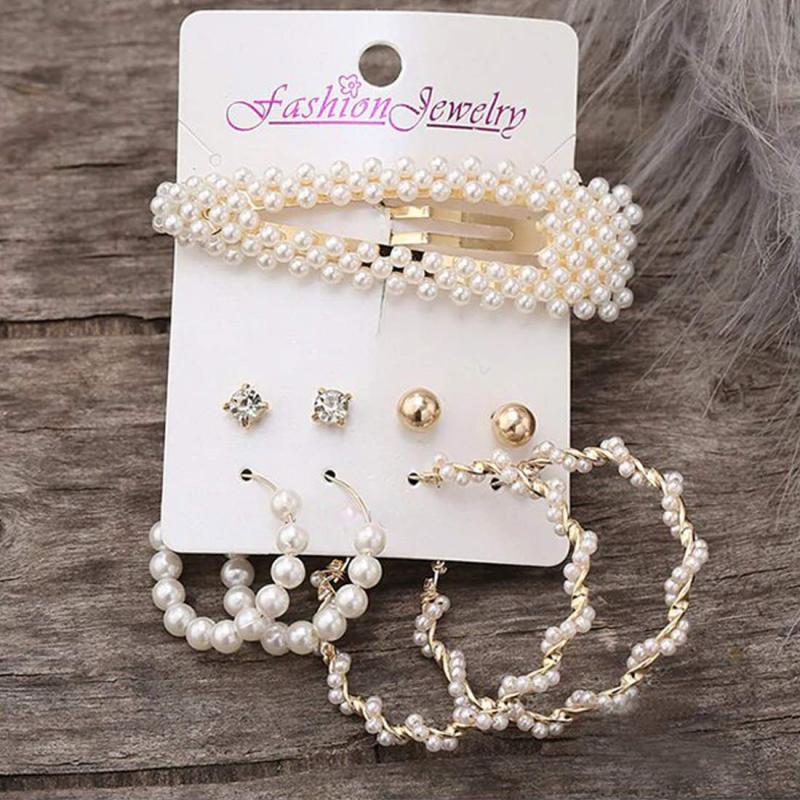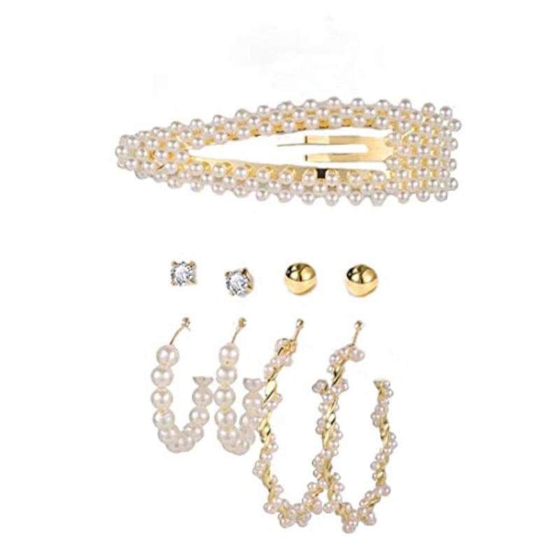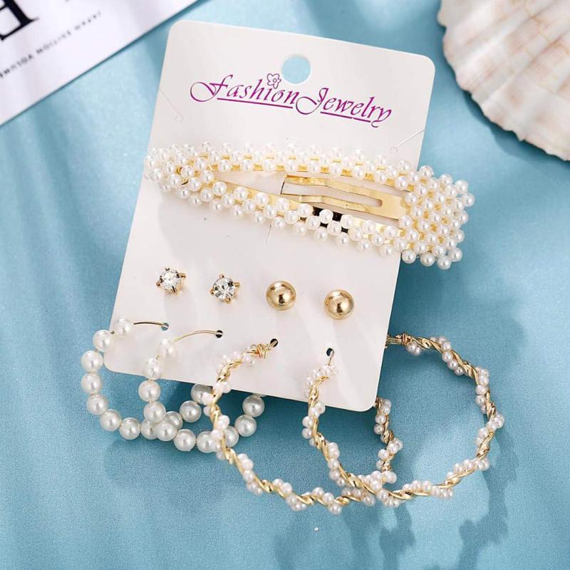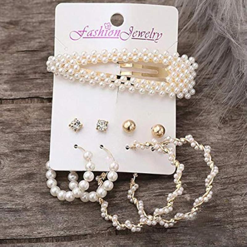 This trendy set includes 4 pairs of earrings featuring a mix of studs and hoops with pearl accents, perfect for adding a touch of elegance to your look.