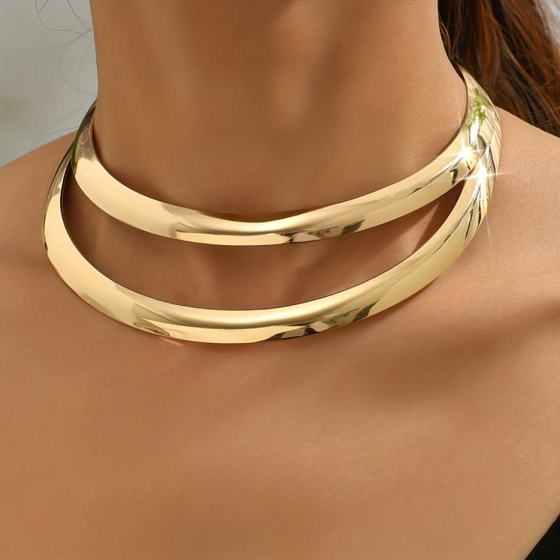 This open cuff choker necklace is crafted from iron for durability and features a dual-layer design. Perfect for daily wear or parties.