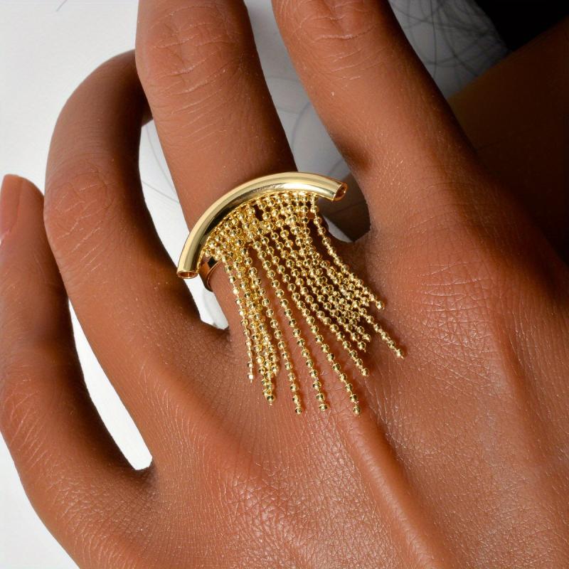 Complete your elegant look with this Middle Eastern American style jewelry set, featuring golden shimmering tassel dangle earrings, rings, necklaces, and bracelets. Perfect for weddings.