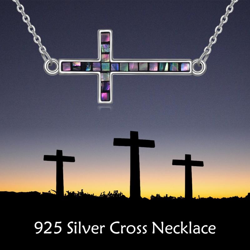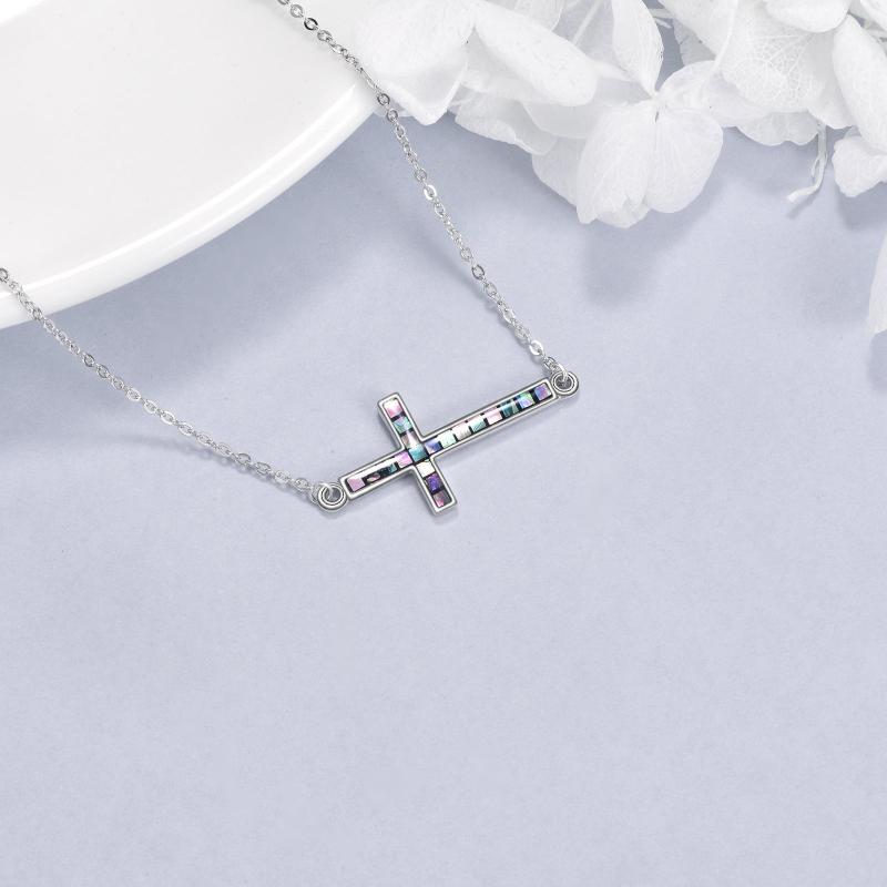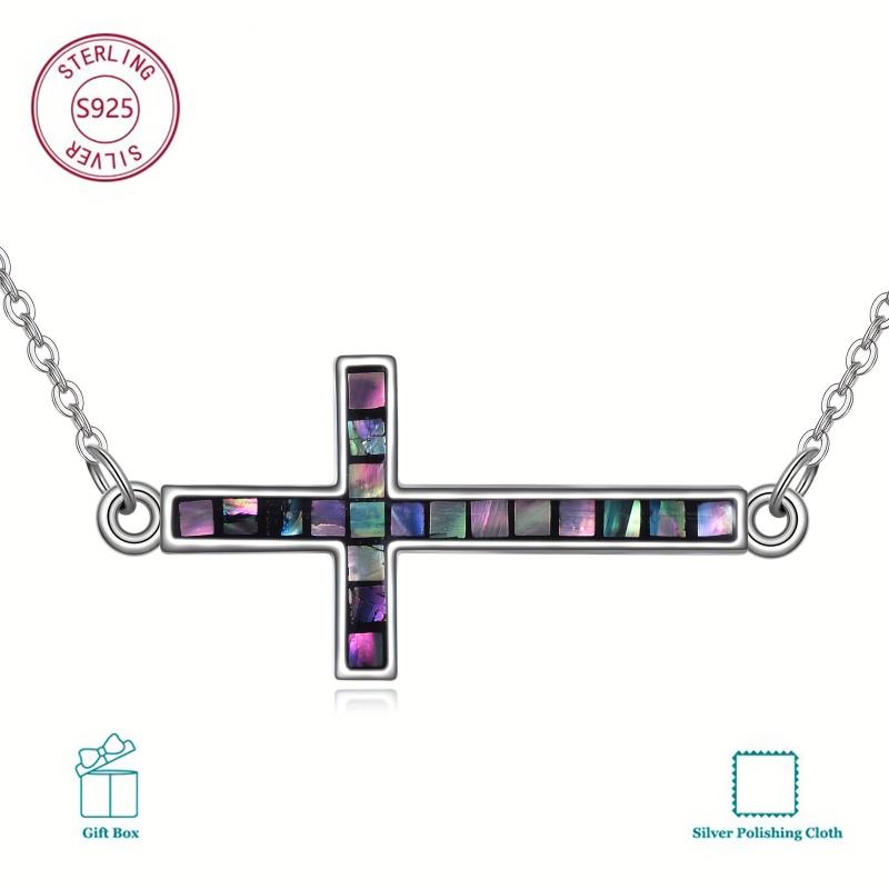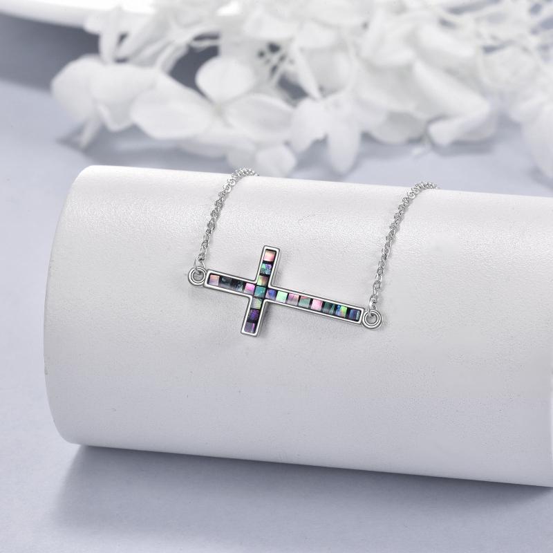 This elegant necklace features a sideways cross pendant adorned with beautiful abalone shell. Perfect for both women and men.