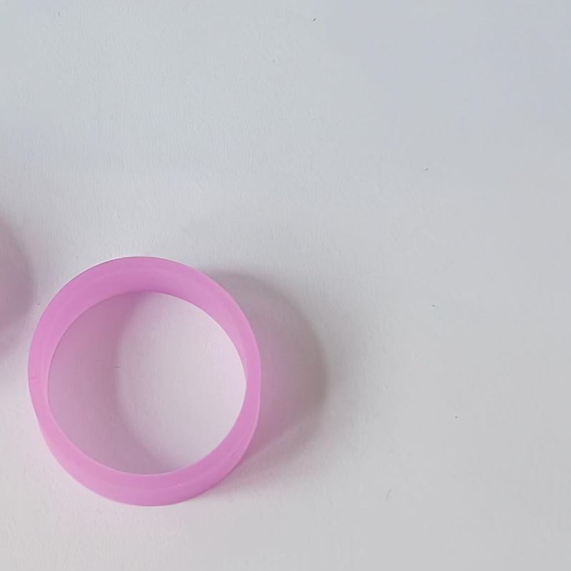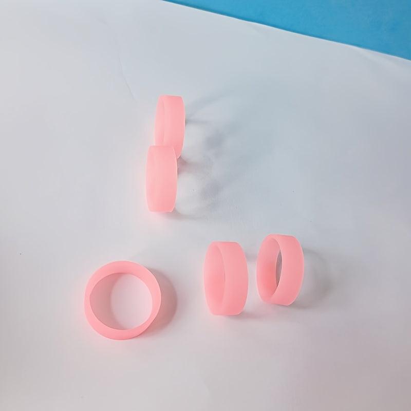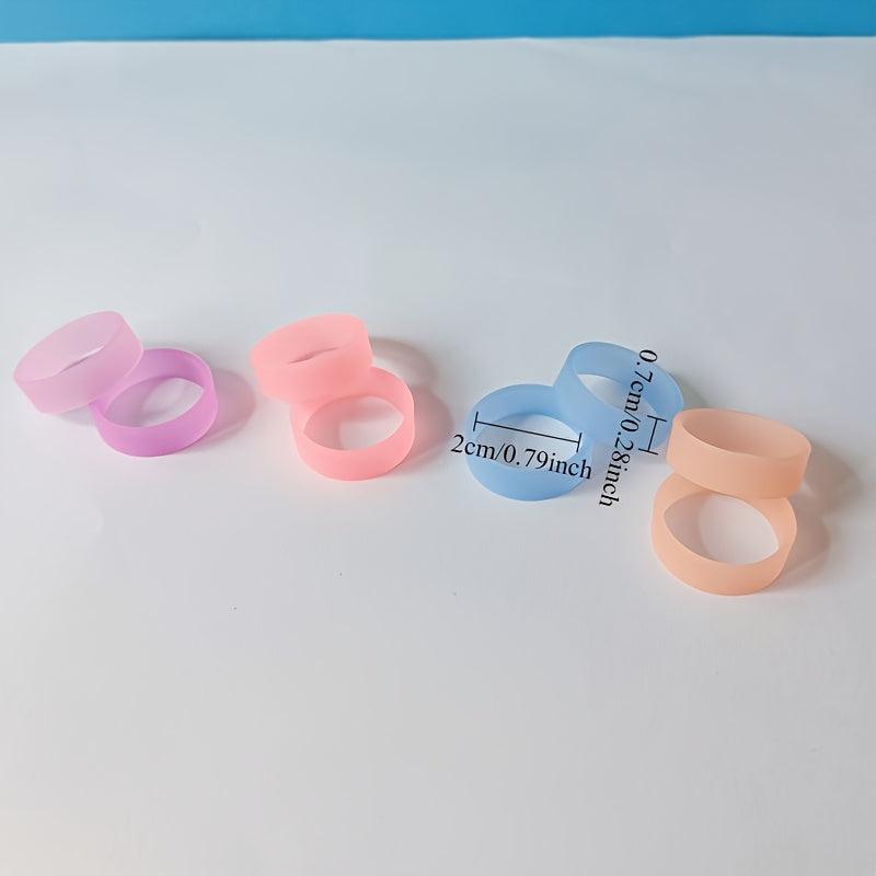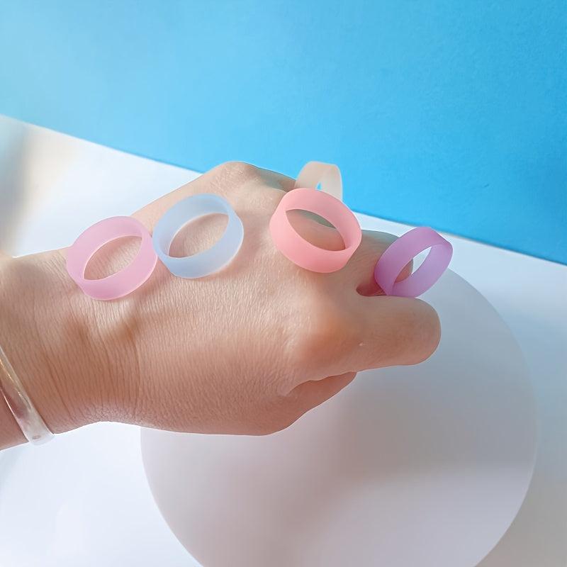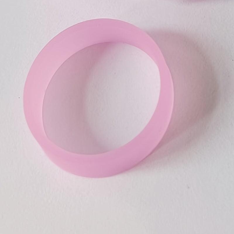 This silicone ring set includes rings in pink, orange, light purple, and lavender colors. They are made of durable and comfortable silicone material, perfect for everyday wear. The stylish design adds a pop of color to your outfit.