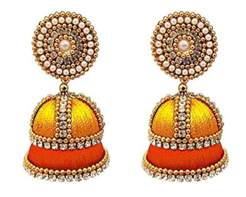 Elegant set of silk jhumki earrings that feature intricate fabric design. Perfect to add a touch of traditional charm to your outfit.