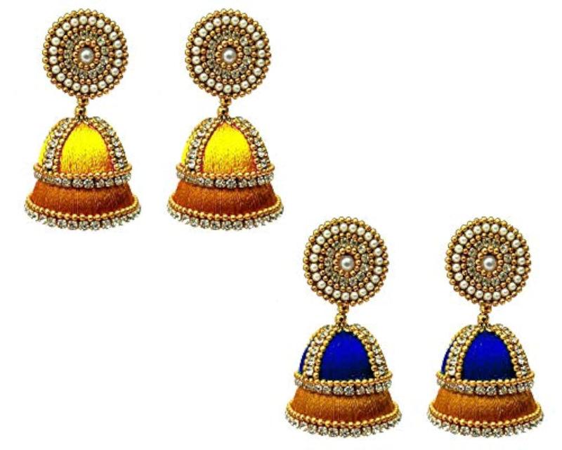 Elegant silk double decker jhumkas in a combination of 2 different colors. Perfect accessory for traditional and ethnic outfits.