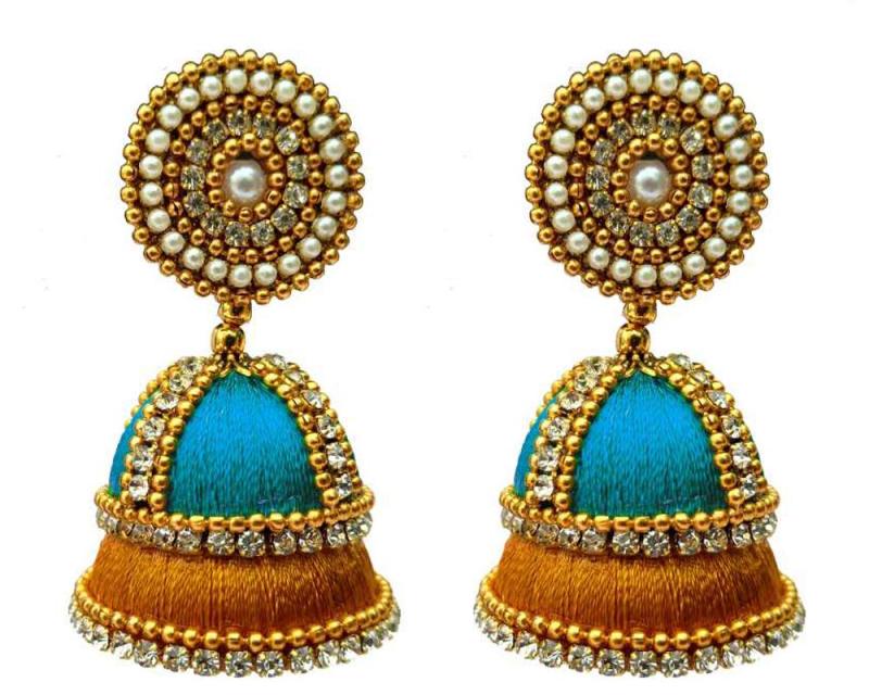 Beautiful silk jhumkas/earrings in light colors. These double decker earrings are perfect for adding a touch of elegance to your outfit.