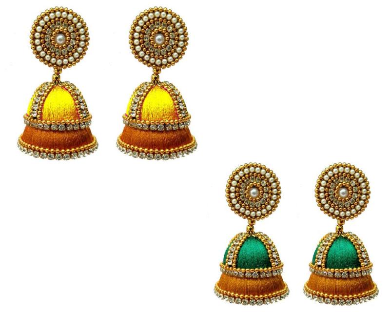 Elegant silk double decker jhumkas/earrings featuring a combination of 2 different colors. Perfect for adding a pop of color to your outfit.