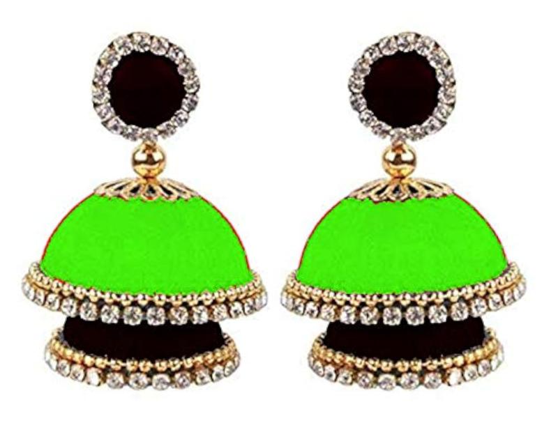 Elegant silk double decker jhumki earrings with silk dori. Perfect for traditional occasions.