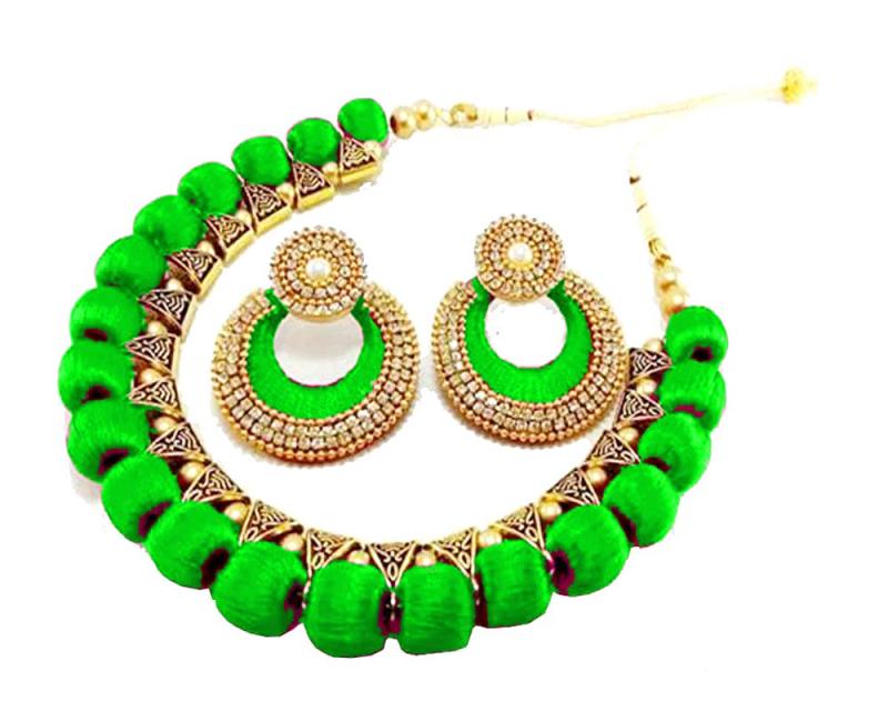 Elegant and stylish silk necklace set with intricate Chandbali earrings and antique bails.