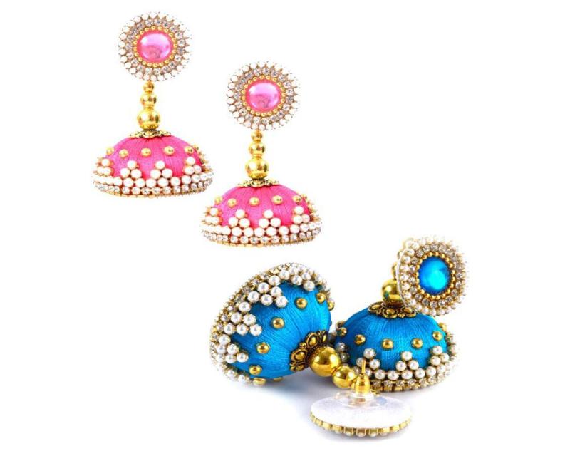 Enhance your ethnic look with these beautiful Silk Pearl Jhumka Earrings featuring beads and fabric details.