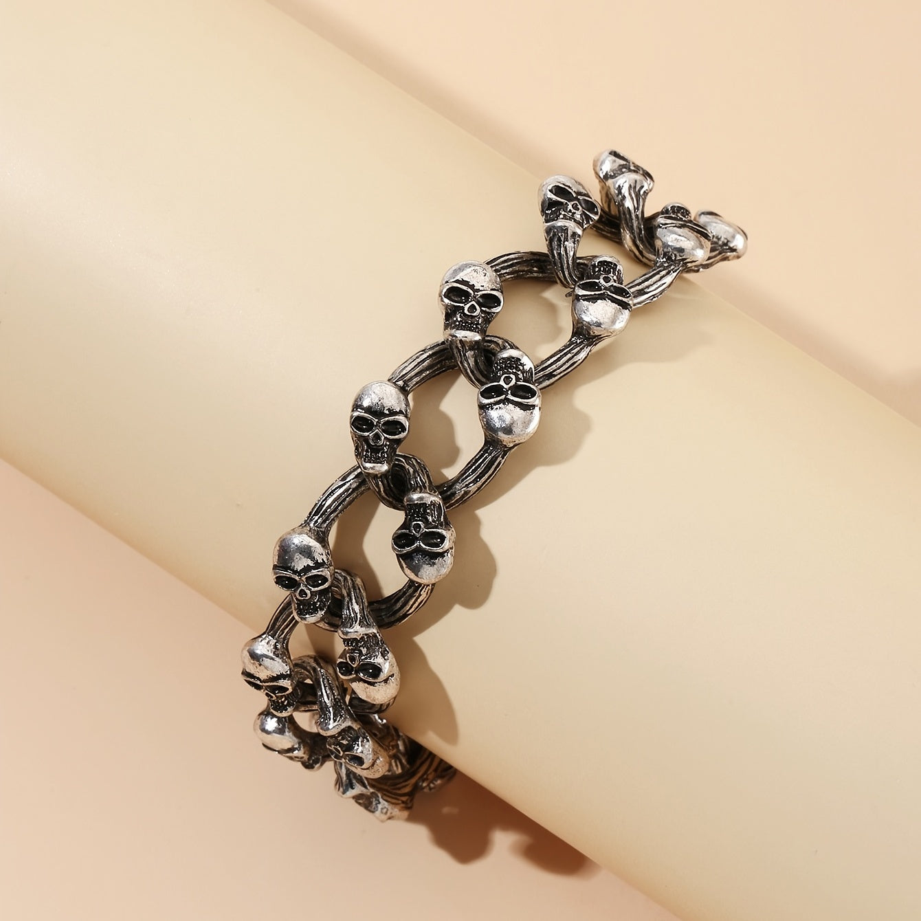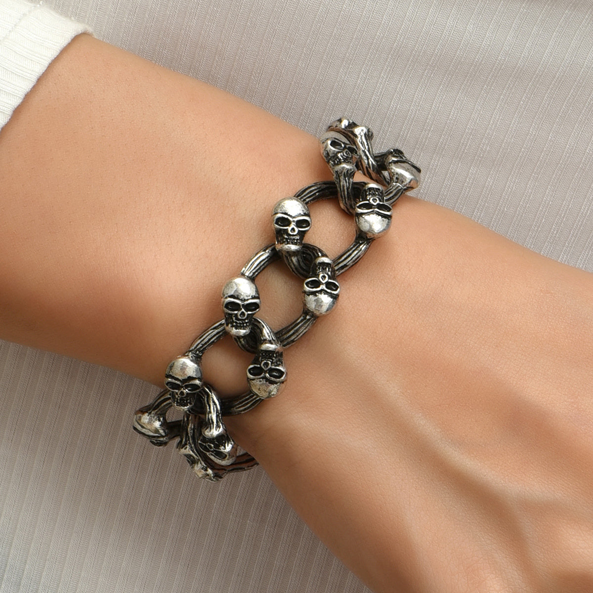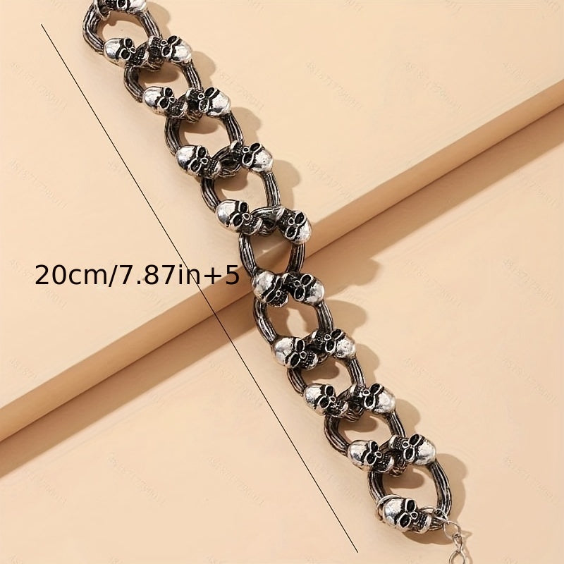 Add a touch of gothic charm with this silver skull bracelet perfect for Halloween parties and goth style lovers.