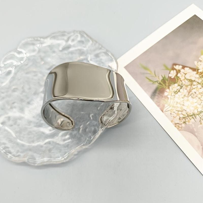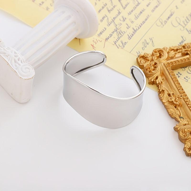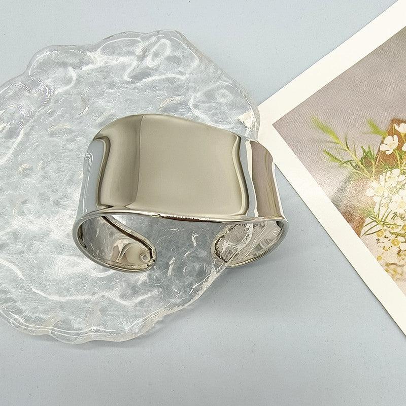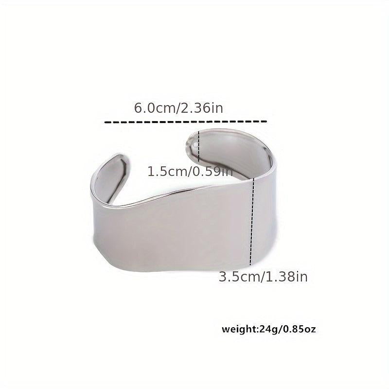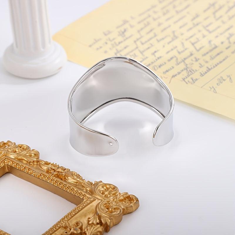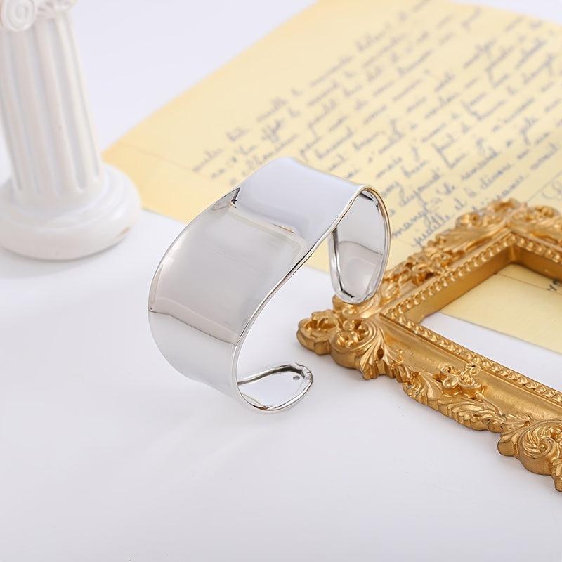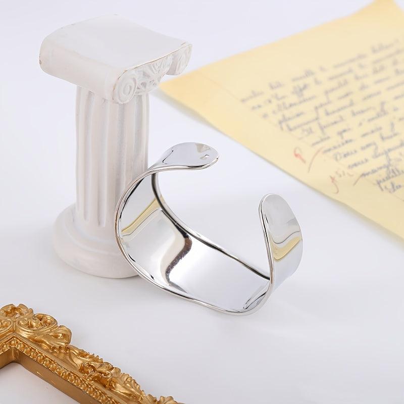 This vintage silver plated cuff bracelet features a curved irregular design with a mirror finish. Perfect for daily wear or vacation attire.