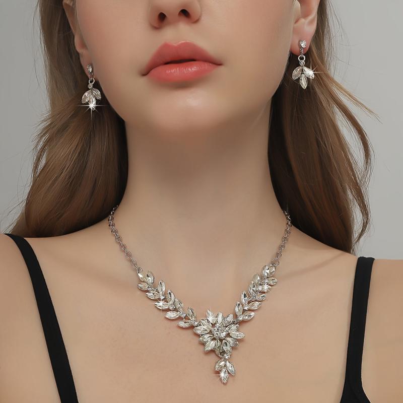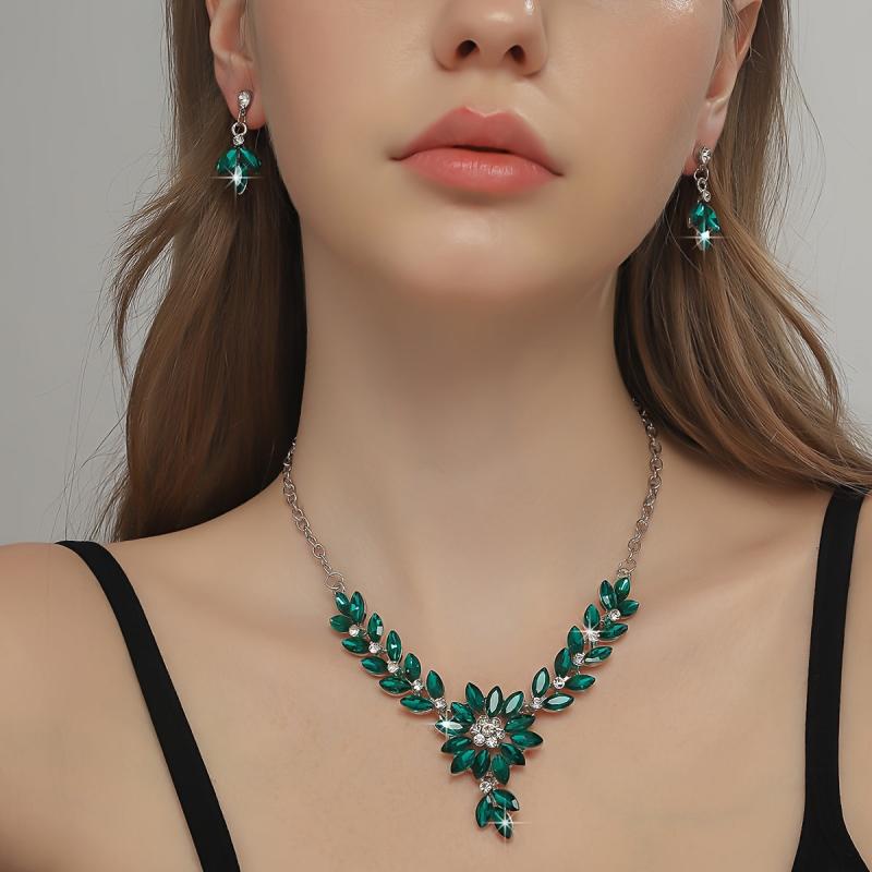 Elegant 3-piece silver plated jewelry set featuring a floral design with green rhinestones. Perfect for parties, banquets, and Valentine's Day holiday jewelry.