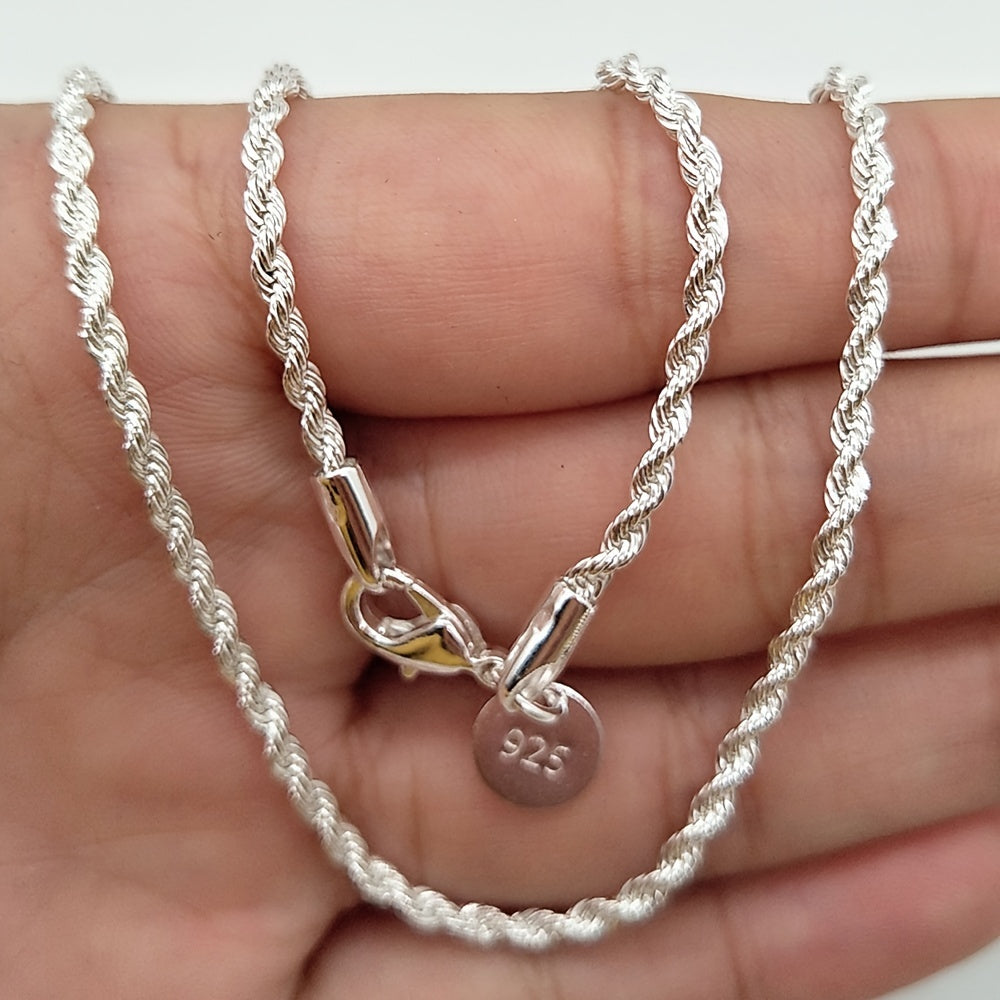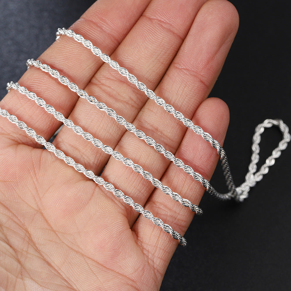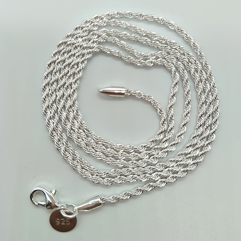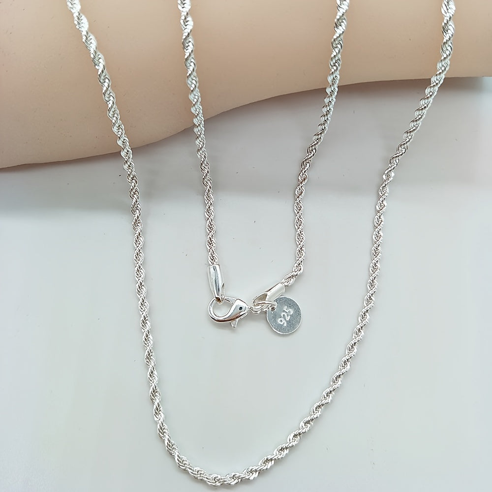 This silver plated necklace features a unique fried dough twist chain design. Available in sizes 16-30 inches, this necklace is a trendy and stylish accessory for any outfit.