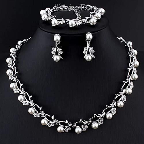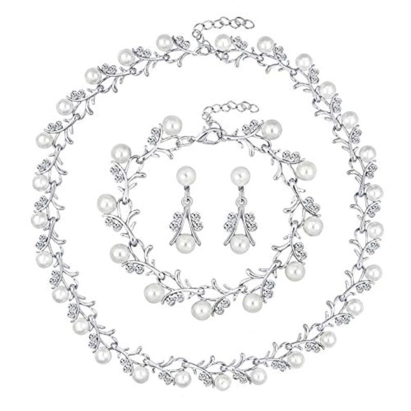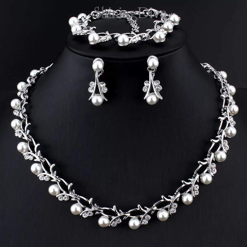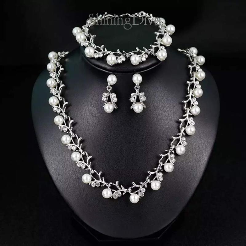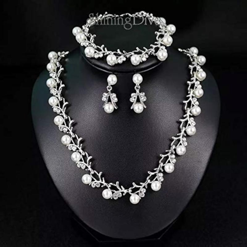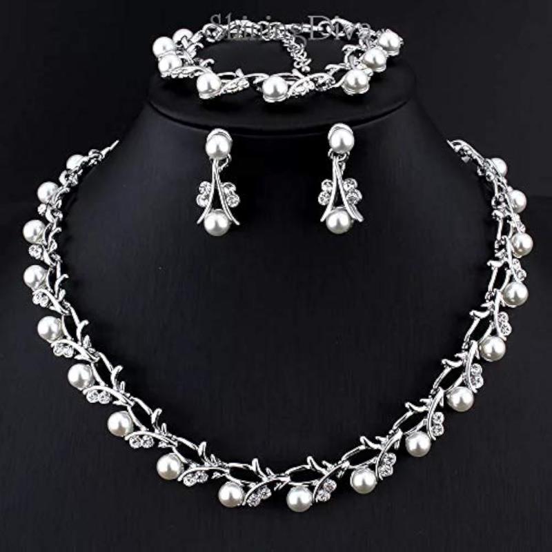 Elegant combo set featuring silver plated pearl necklace, earrings, and bracelet.