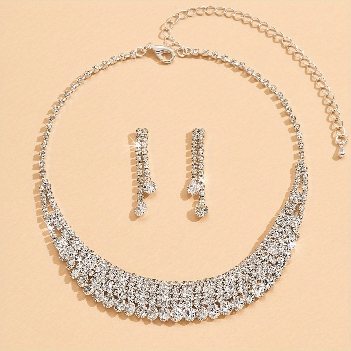Complete your elegant look with this classic jewelry set. The set includes earrings and necklace with rhinestone inlay, perfect for engagements, weddings, parties, and more.