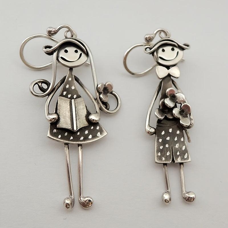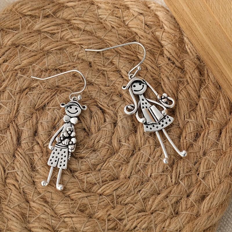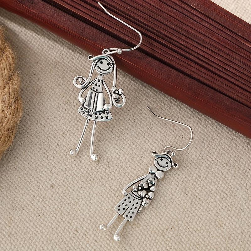 These adorable silvery earrings feature cartoon dolls hanging design, perfect for family and friends. Made for pierced ears.