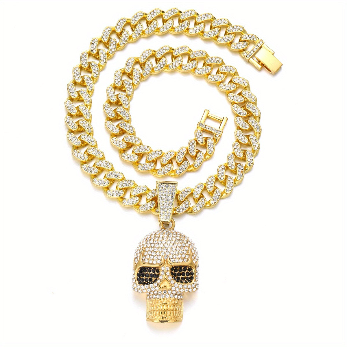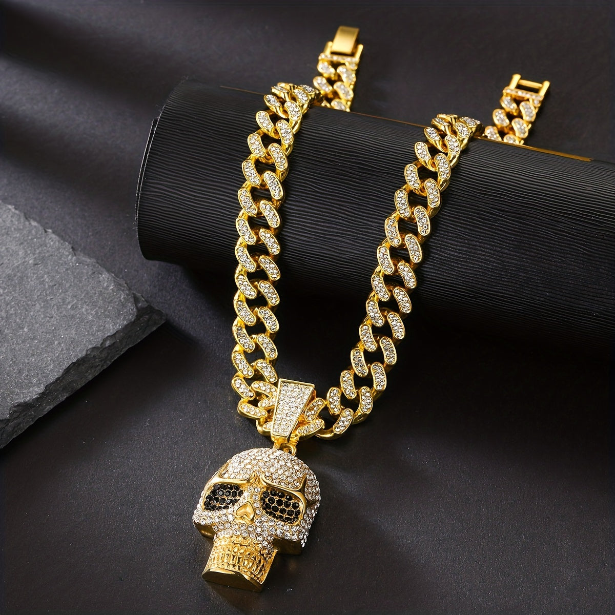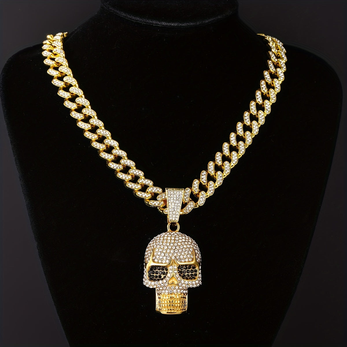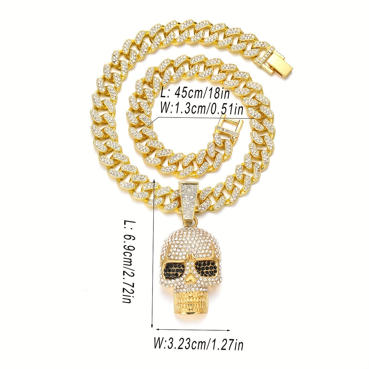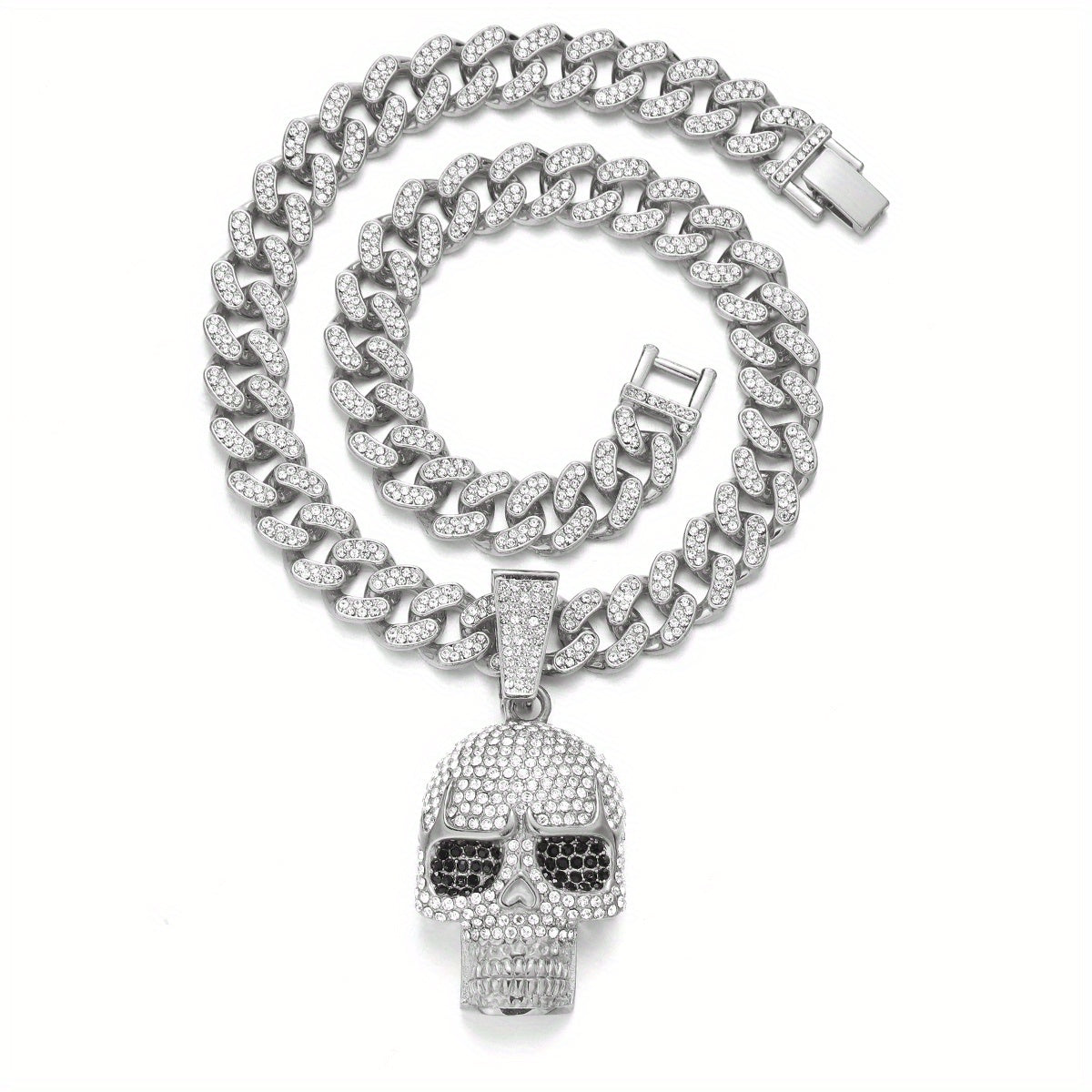 This stylish necklace features a skull pendant with rhinestone studded Cuban link chain for a bold and edgy look. Suitable for both men and women.