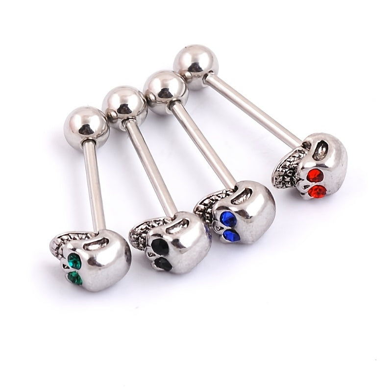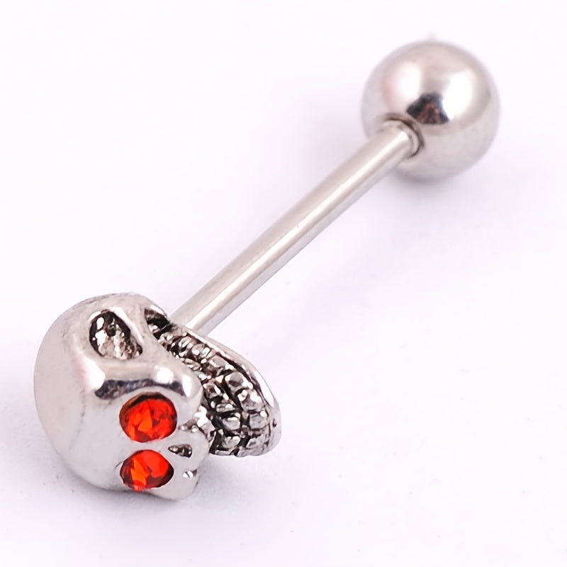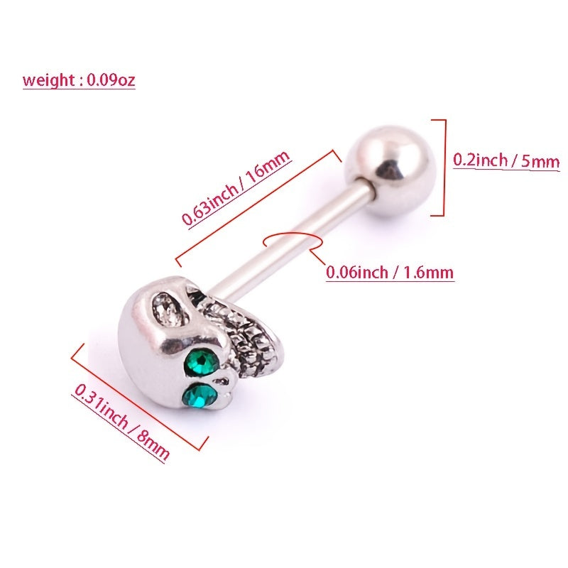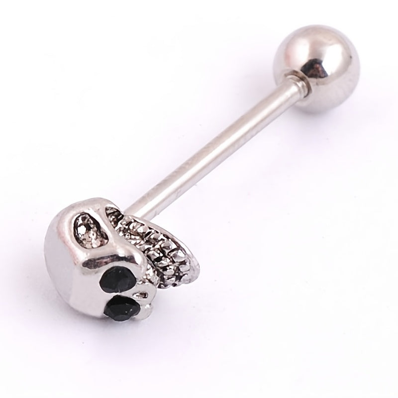 This stainless steel tongue stud features a skull shape design with tiny zircon inlay. A unique body piercing jewelry gift for women.