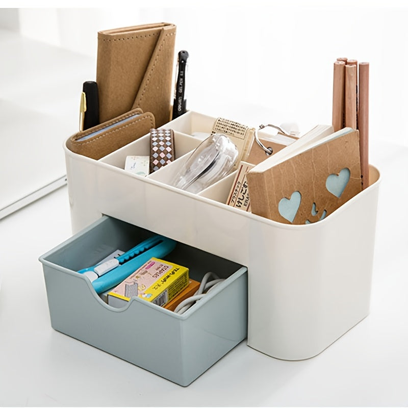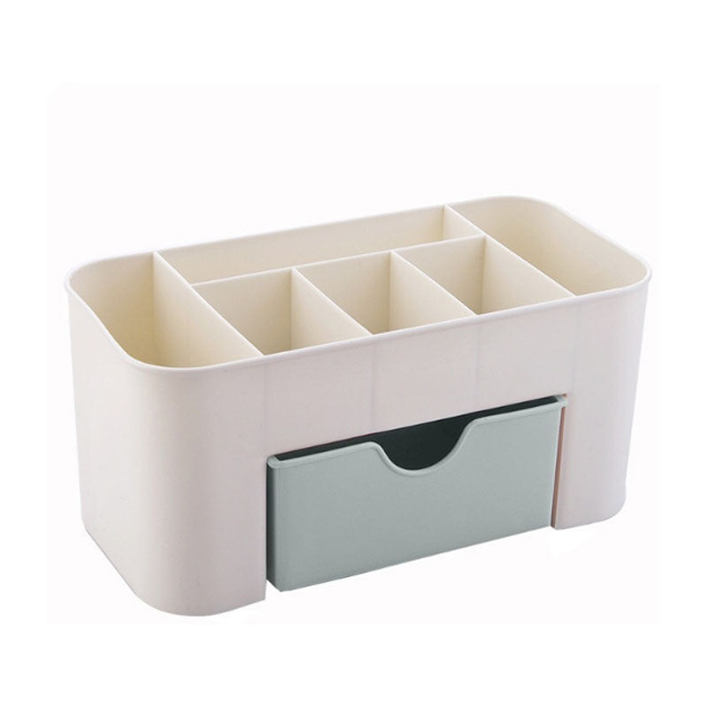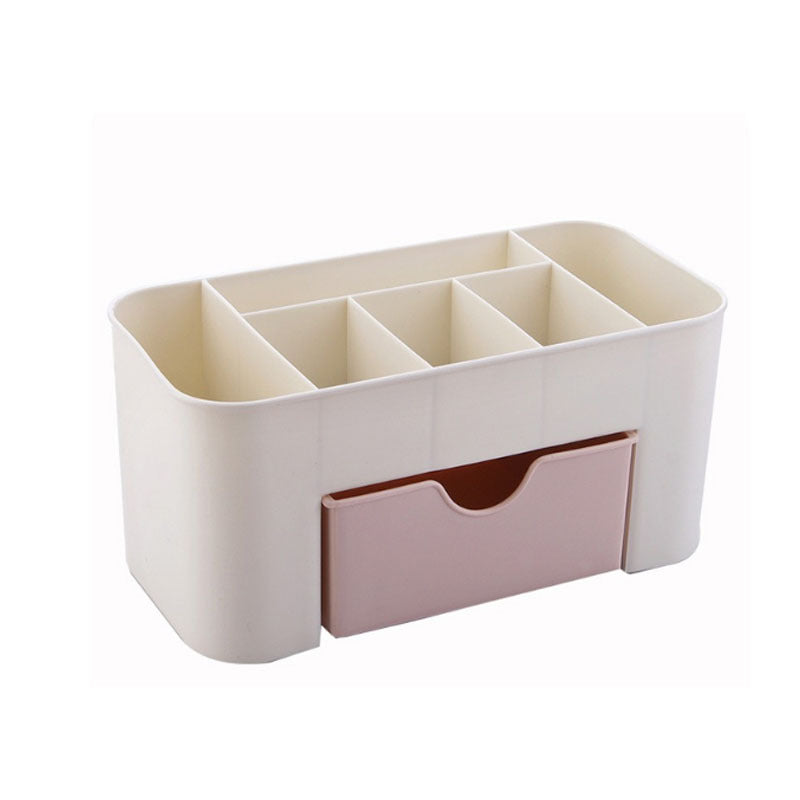 Keep your jewelry and cosmetics neatly organized with this plastic makeup organizer. Perfect for small spaces and clutter-free countertops.