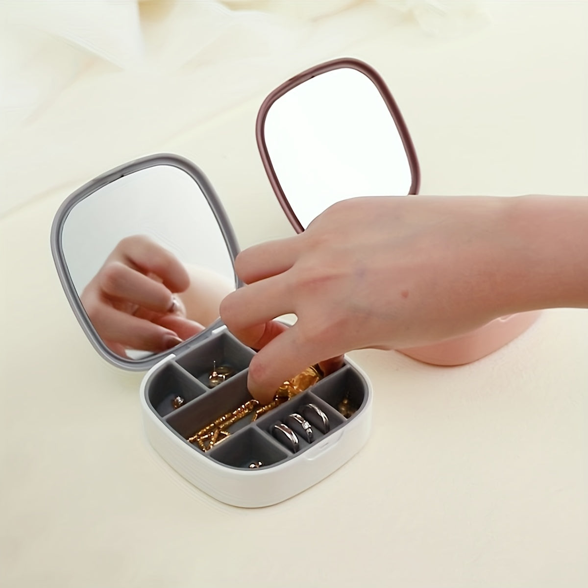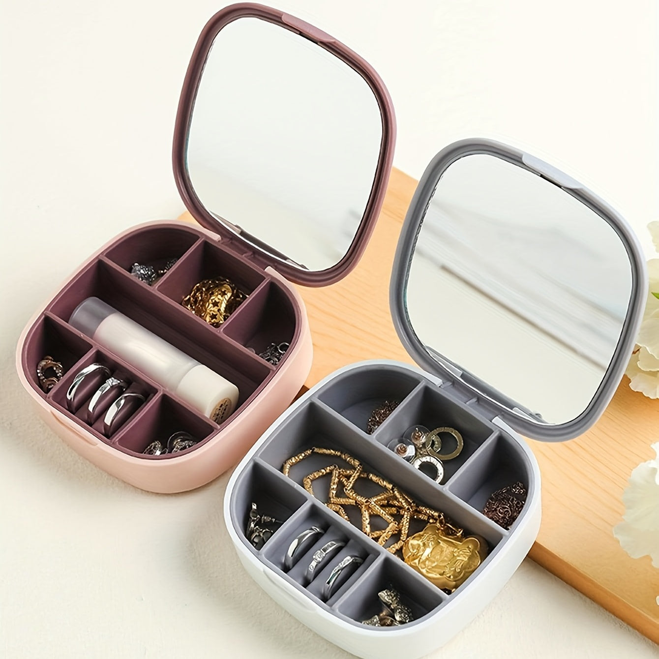 This small mini makeup mirror jewelry storage box is perfect for keeping your jewelry organized and easily accessible. It features a mirror on the lid for convenience.