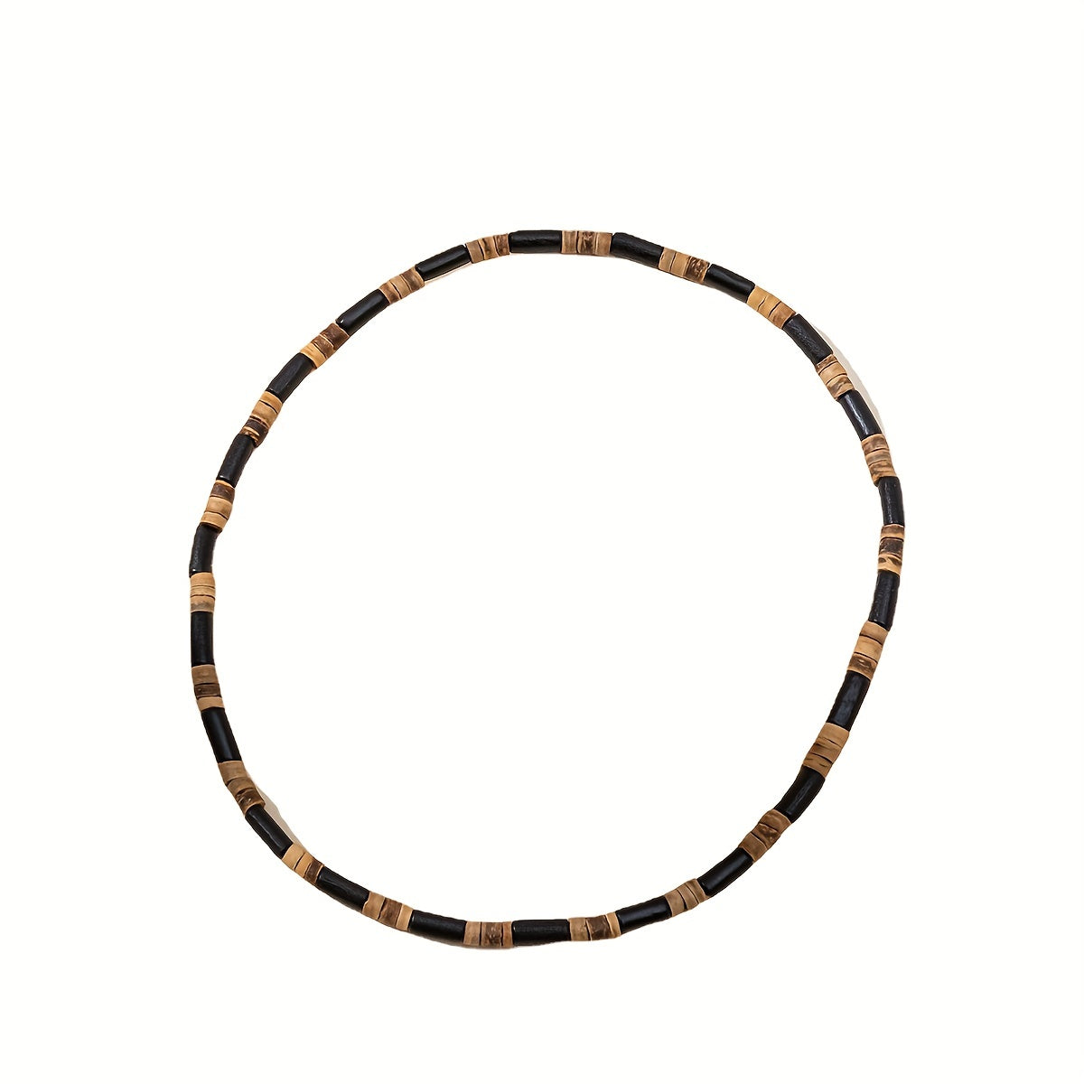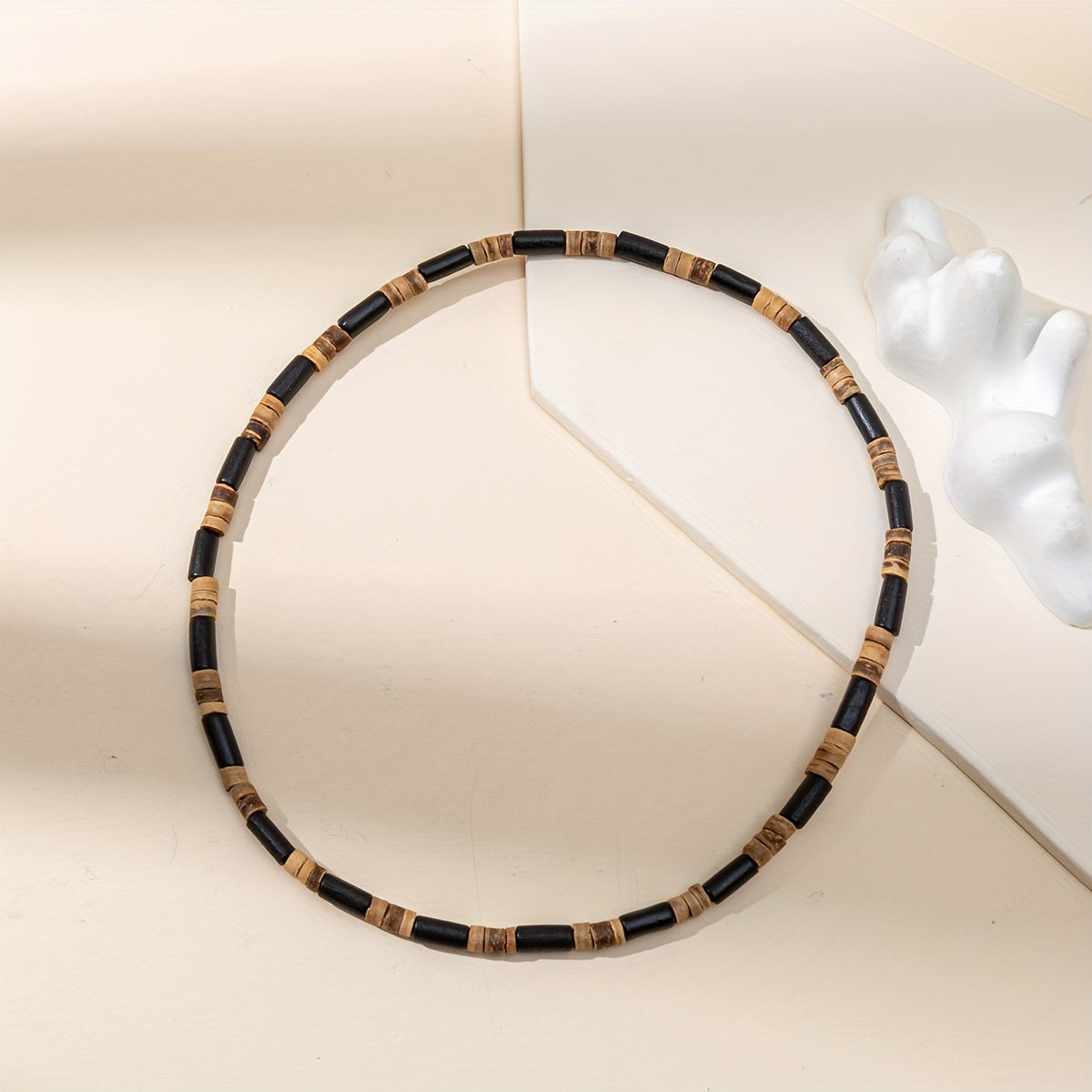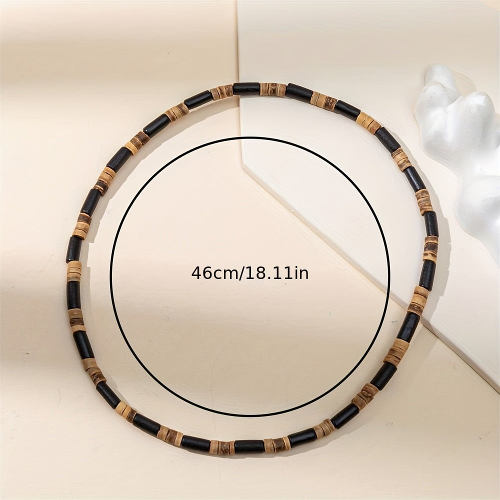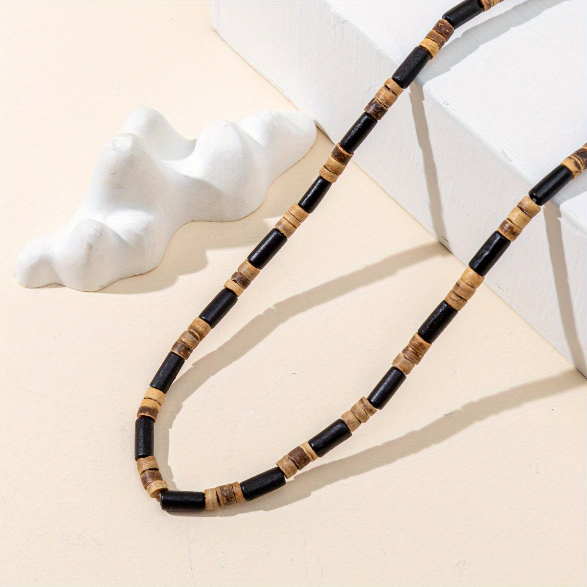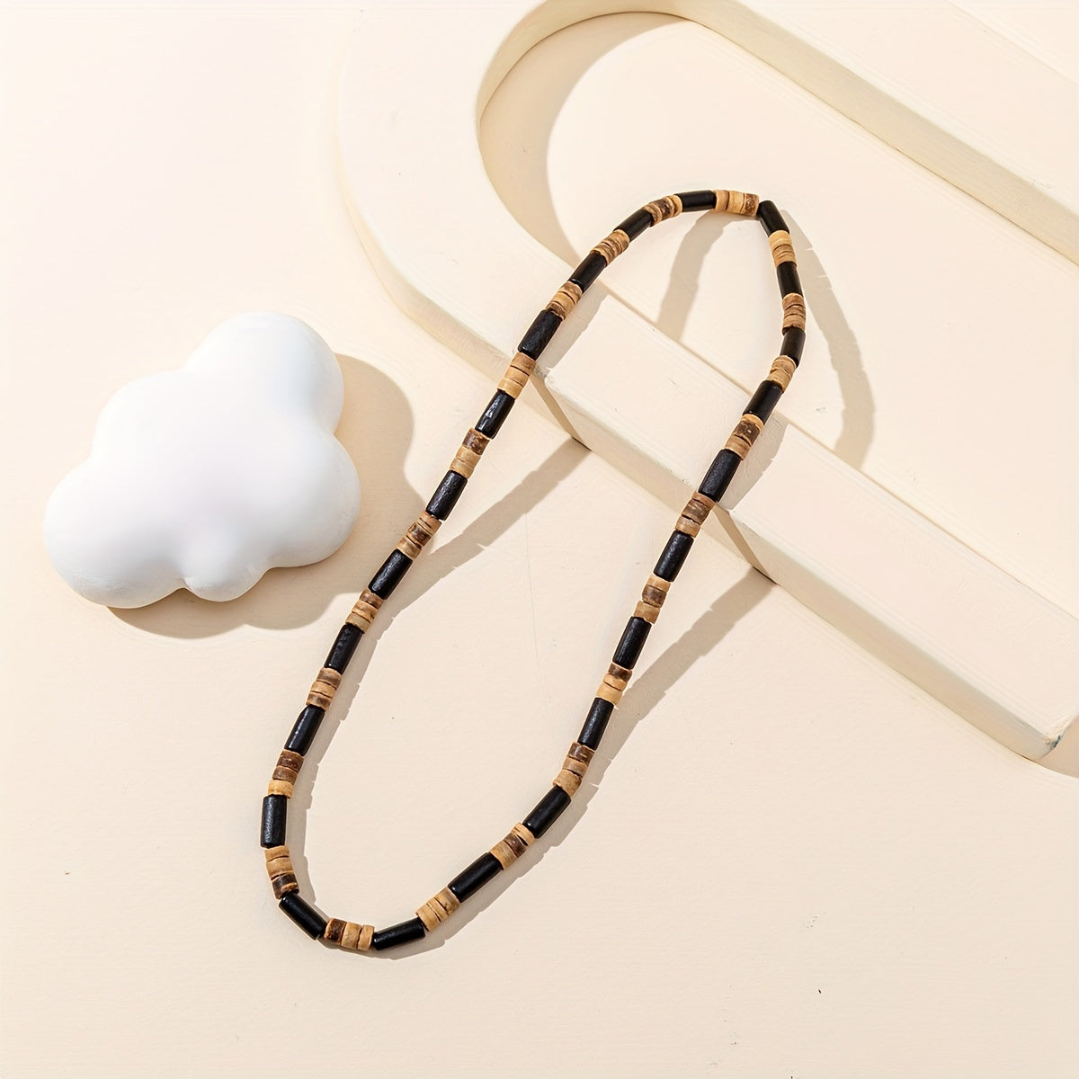 Add a touch of vintage charm to your outfits with this small retro style necklace featuring a patterned stone and wood mix. Perfect for casual or vacation styling.