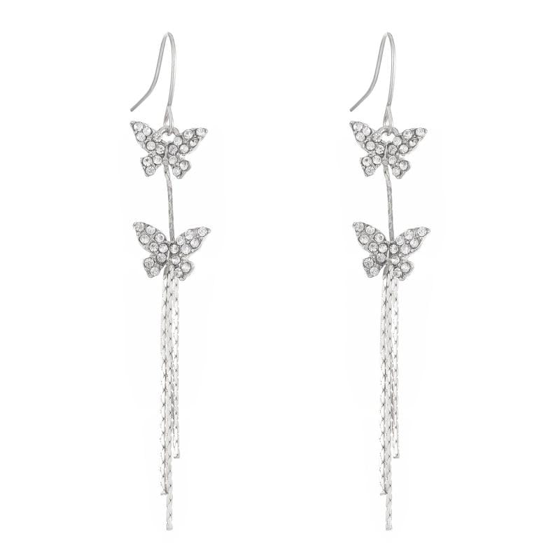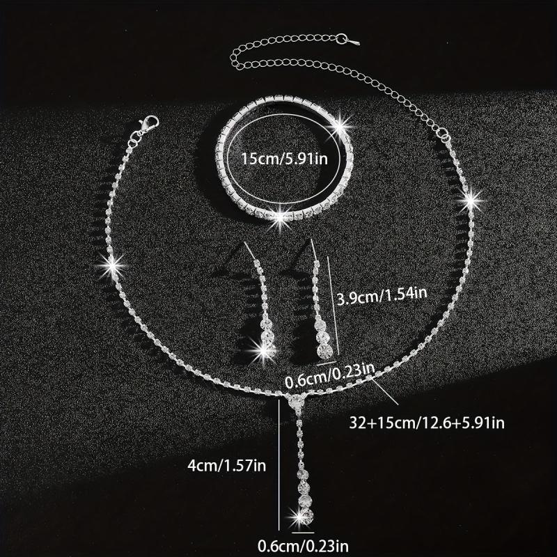 Complete your wedding look with this minimalist jewelry set featuring a long necklace, earrings, and bracelet, all adorned with sparkling gems.